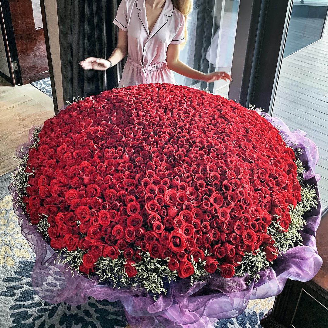 Тысяча одна роза в единой композиции — момент, который запоминается навсегда. Море красных бутонов создает почти сюрреалистичную картину живого цветочного полотна.