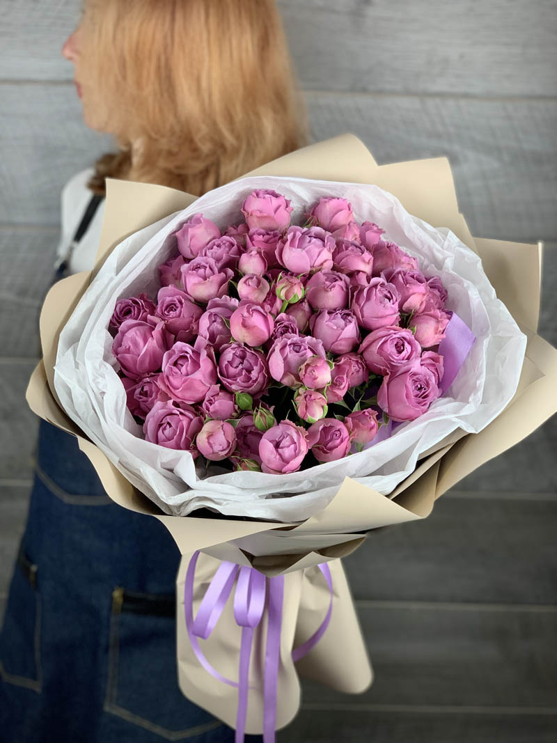 Одиннадцать кустовых роз с густыми многолепестковыми бутонами в нежно-розовой гамме. Каждая ветка раскрывается несколькими головками, создавая пышную объемную форму. Для тех, кто любит выразительные букеты с характером.