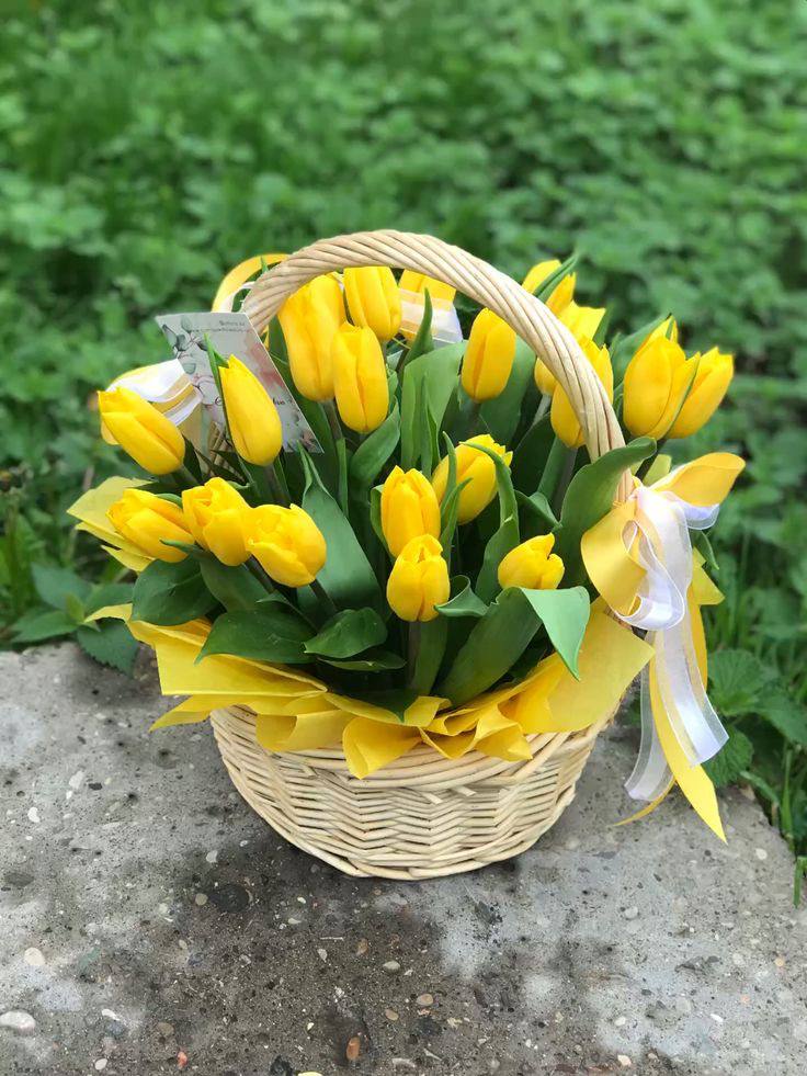Солнечные бутоны собраны в плетёную корзину и создают яркое пятно света в любом интерьере. Тюльпаны держат форму и радуют свежестью несколько дней подряд.