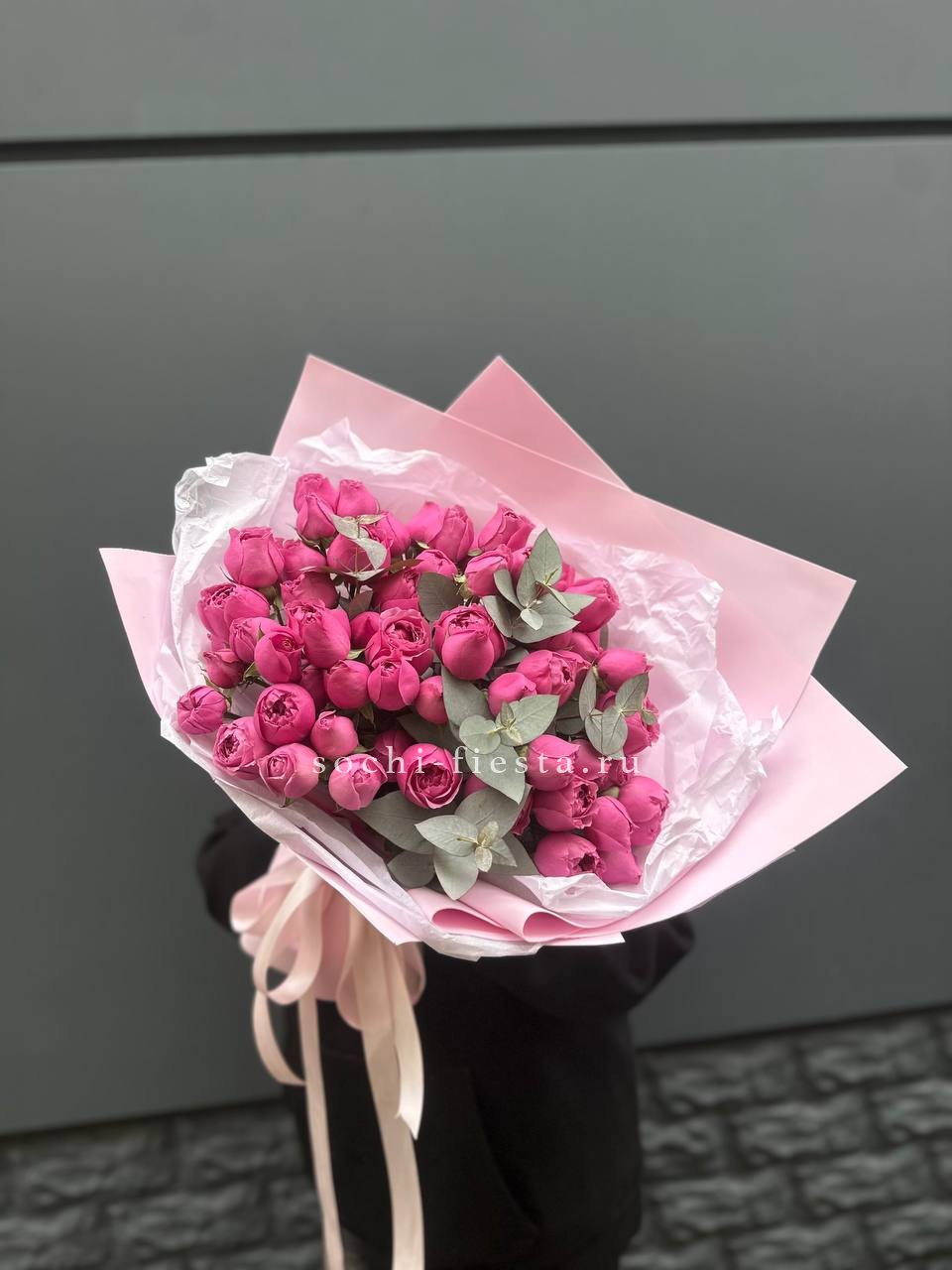 Тридцать один бутон Джумилии собран в плотную композицию с графичным силуэтом. Лепестки раскрываются слоями, создавая объёмную текстуру в цилиндре. Эвкалипт добавляет вертикальный ритм и завершает форму.