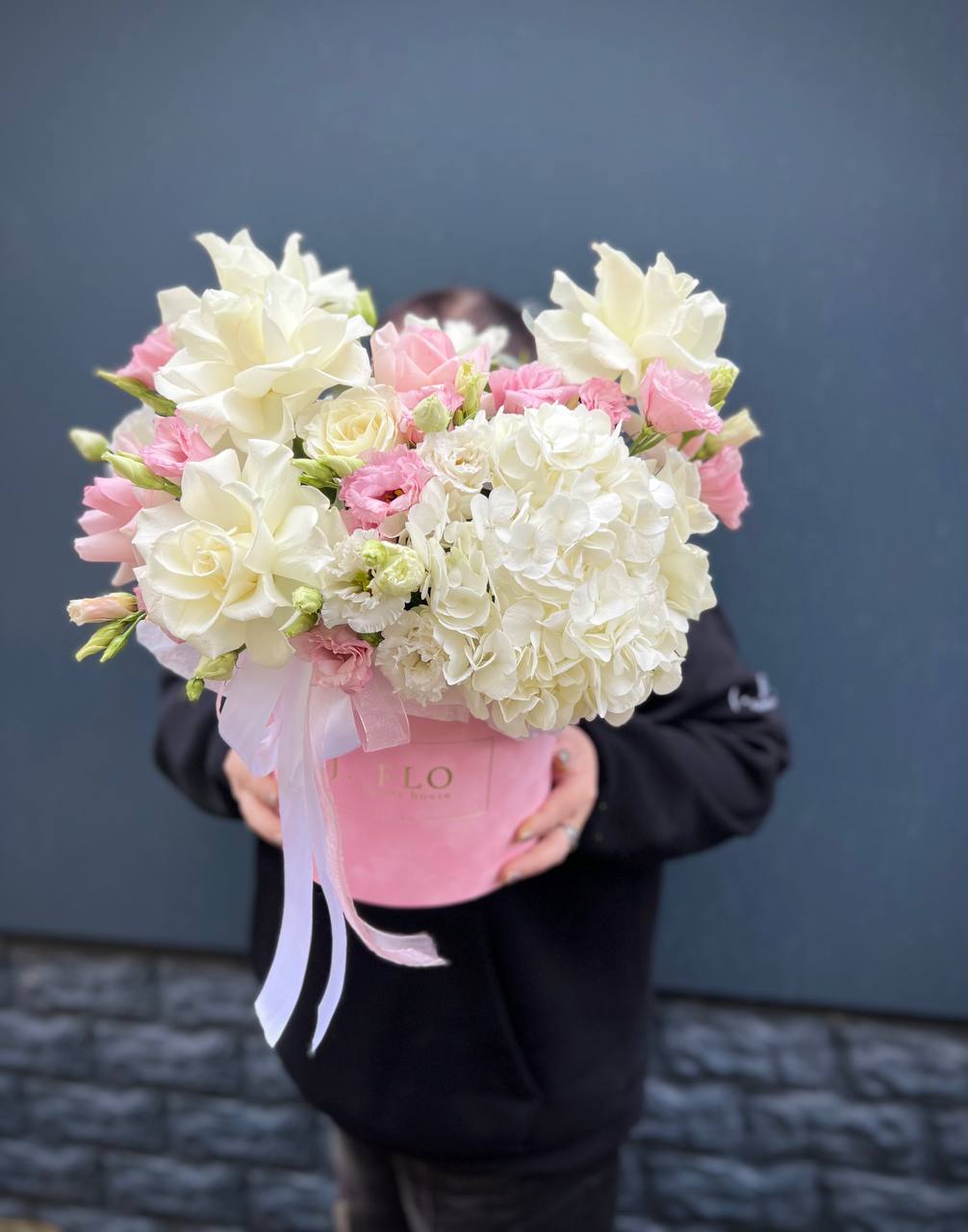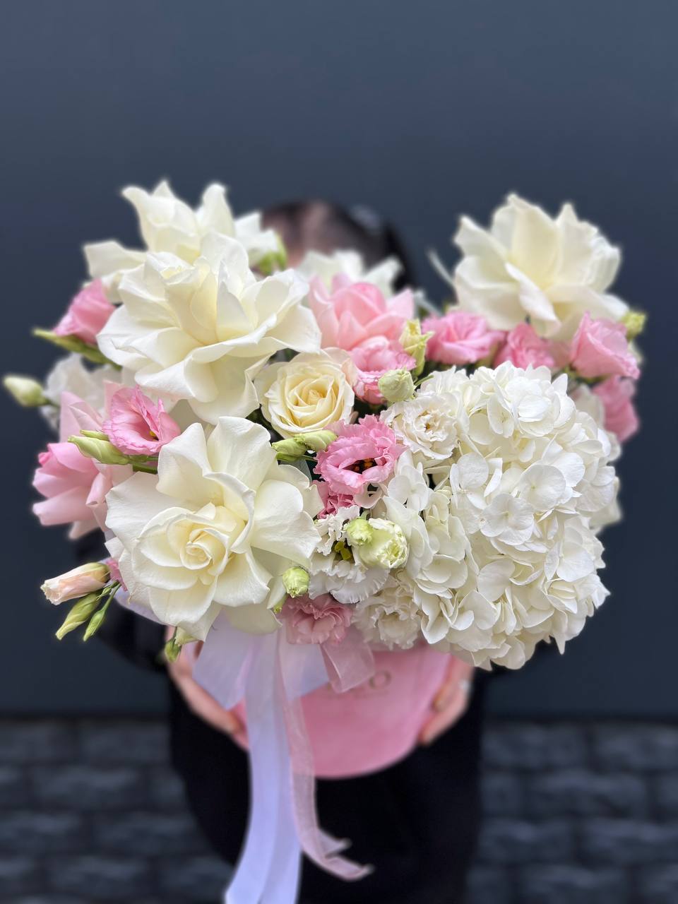Пятьдесят один бутон в мягкой бело-розовой гамме создает объемную форму с живым ритмом. Микс оттенков добавляет воздушности и естественной динамики композиции.
