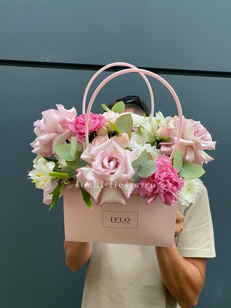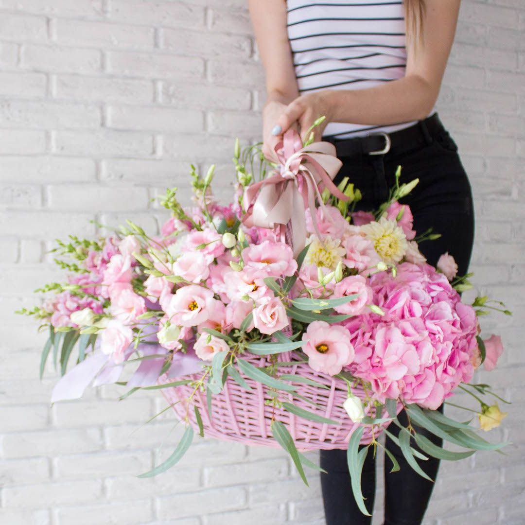гортензия нежно-розовых оттенков, эустома, львиный зев или маттиола, розовые розы, эвкалипт, вспомогательная зелень, лента, светлая корзин.