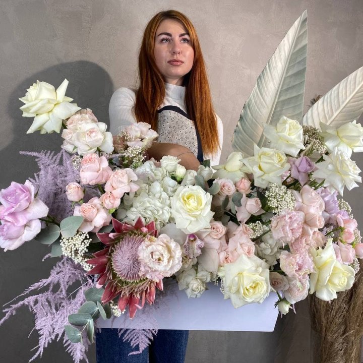 Авторские букеты гиганты в Смоленске — формат для тех событий в жизни города, когда обычного букета недостаточно. Юбилей 50 лет, свадьба, открытие бизнеса, значимое корпоративное поздравление — именно к таким поводам клиент заказывает гигантский авторский букет, который невозможно не заметить. Флорист в Смоленске создаёт авторские букеты гиганты из 101 и более роз, пионовые гиганты в сезоне, корзины-гиганты для торжественных вручений. Именно масштаб флористического жеста делает момент незабываемым для получателя и всех присутствующих.