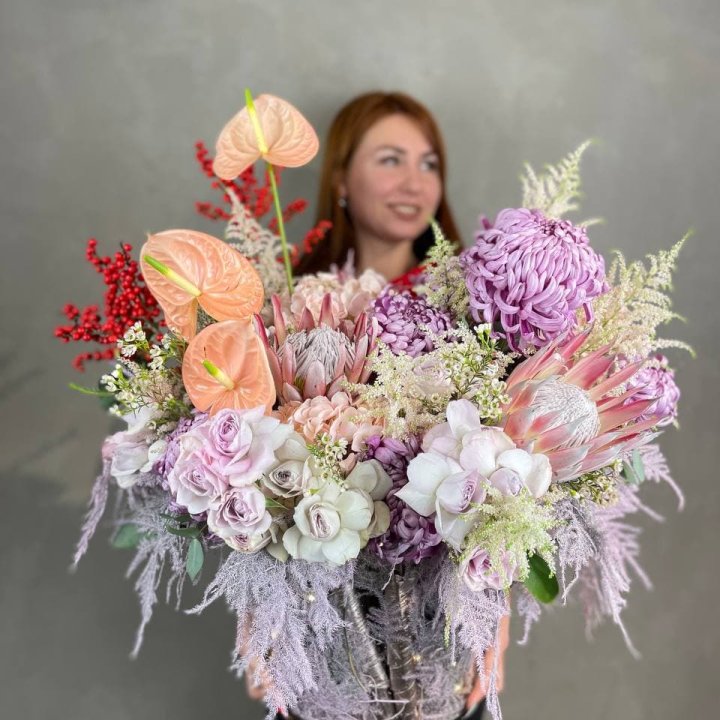 Ценовой диапазон авторских букетов гигантов в Смоленске: монобукет из 101 розы — от 5 500 до 16 000 руб. Пионовый гигант из 70 пионов — от 10 000 до 28 000 руб. в мае-июне. Смешанный авторский гигант — от 9 000 до 28 000 руб. Корзина-гигант из сезонных цветов — от 6 000 руб. Зимний гигант из 151 розы — от 11 000 до 28 000 руб. Флорист согласует бюджет и предлагает несколько вариантов.