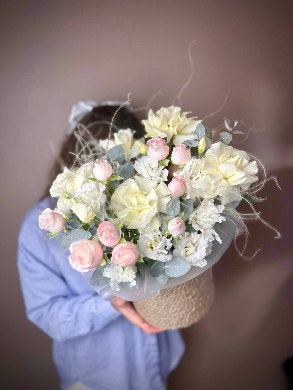 Французские и пионовидные розы белого цвета соседствуют с воздушными метёлками ковыля и соцветиями эустомы. Композиция собрана в цилиндре и помещена в джутовое кашпо для устойчивости.