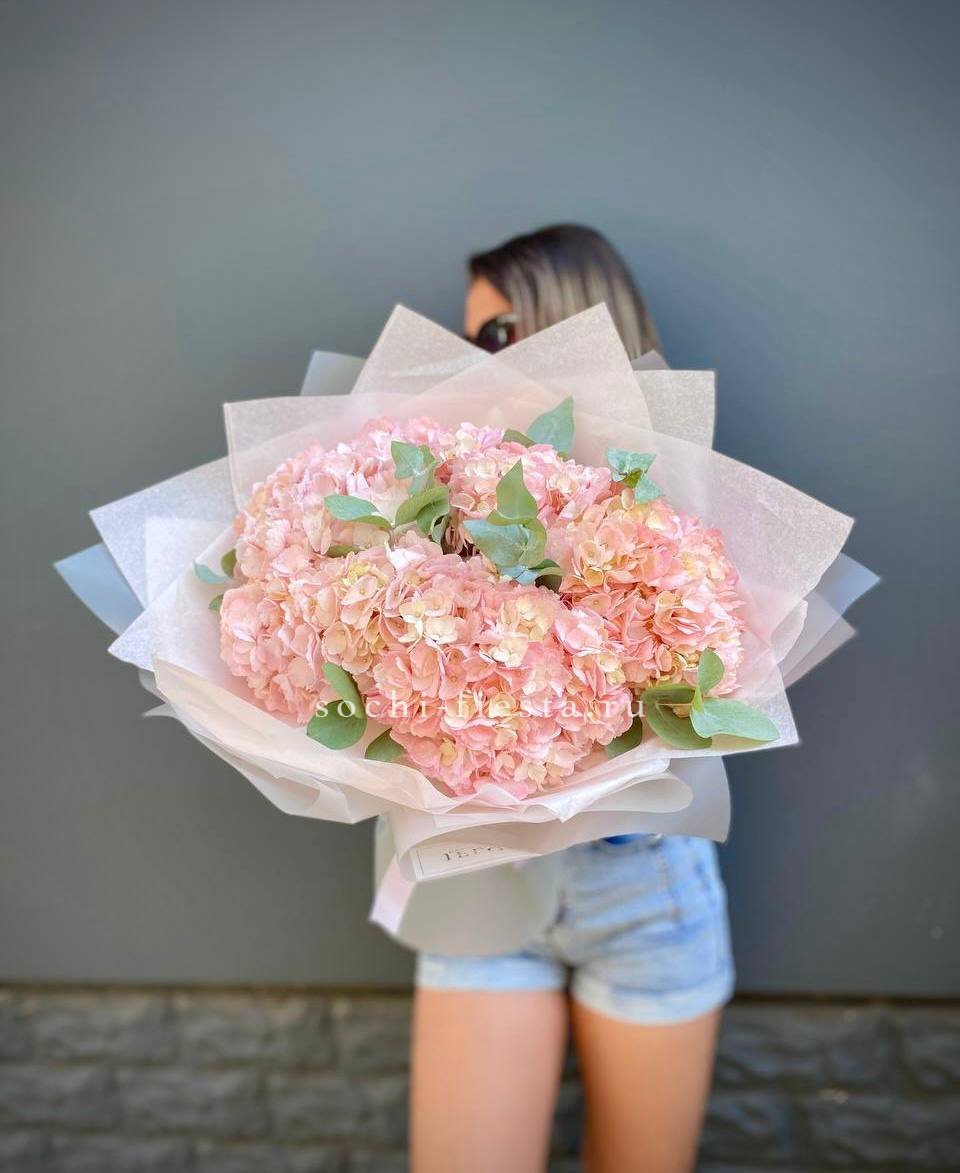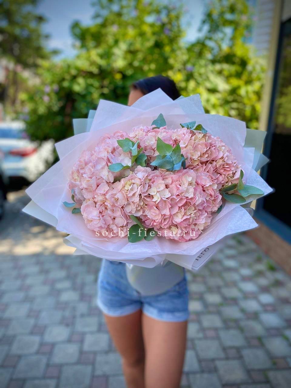 гортензия, мисти бабблс, роза, эустома, диантус, эвкалипт, авторская упаковка, лента