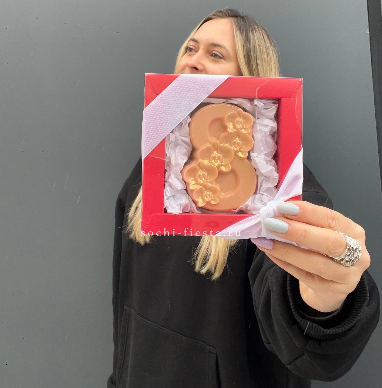 цифра 8 из бельгийского шоколада (белый шоколад: сахар, масло какао, сухое цельное молоко, соевый лецитин, натуральный амортизатор Ваниль). Ручная роспись.