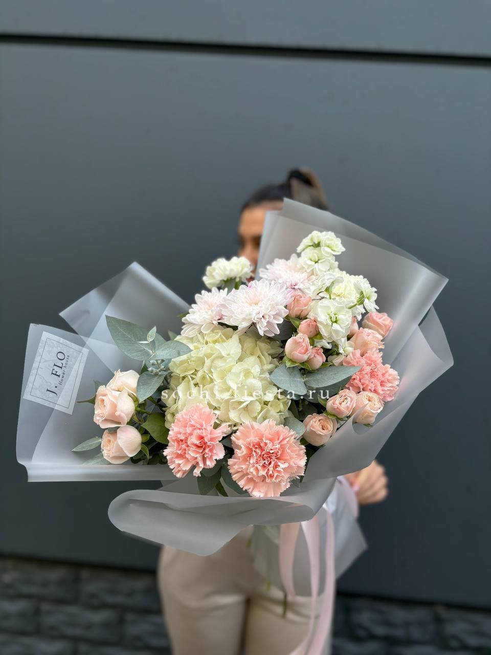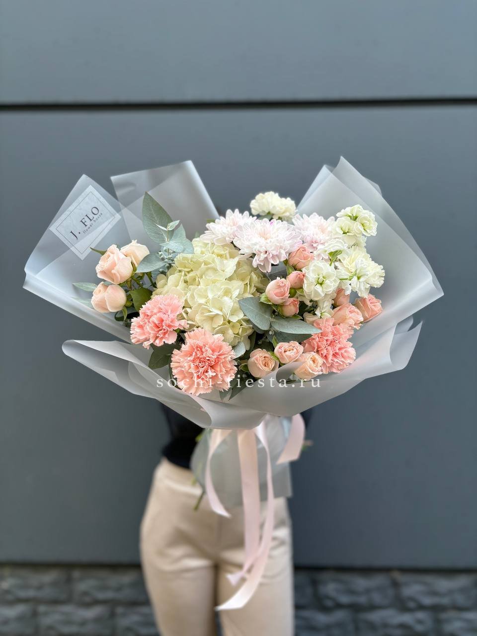 Многослойная композиция с герберами, эустомой и гортензией образует плавные переходы оттенков. Антиринум вытягивает силуэт вверх, придавая букету лёгкость и воздушность.
