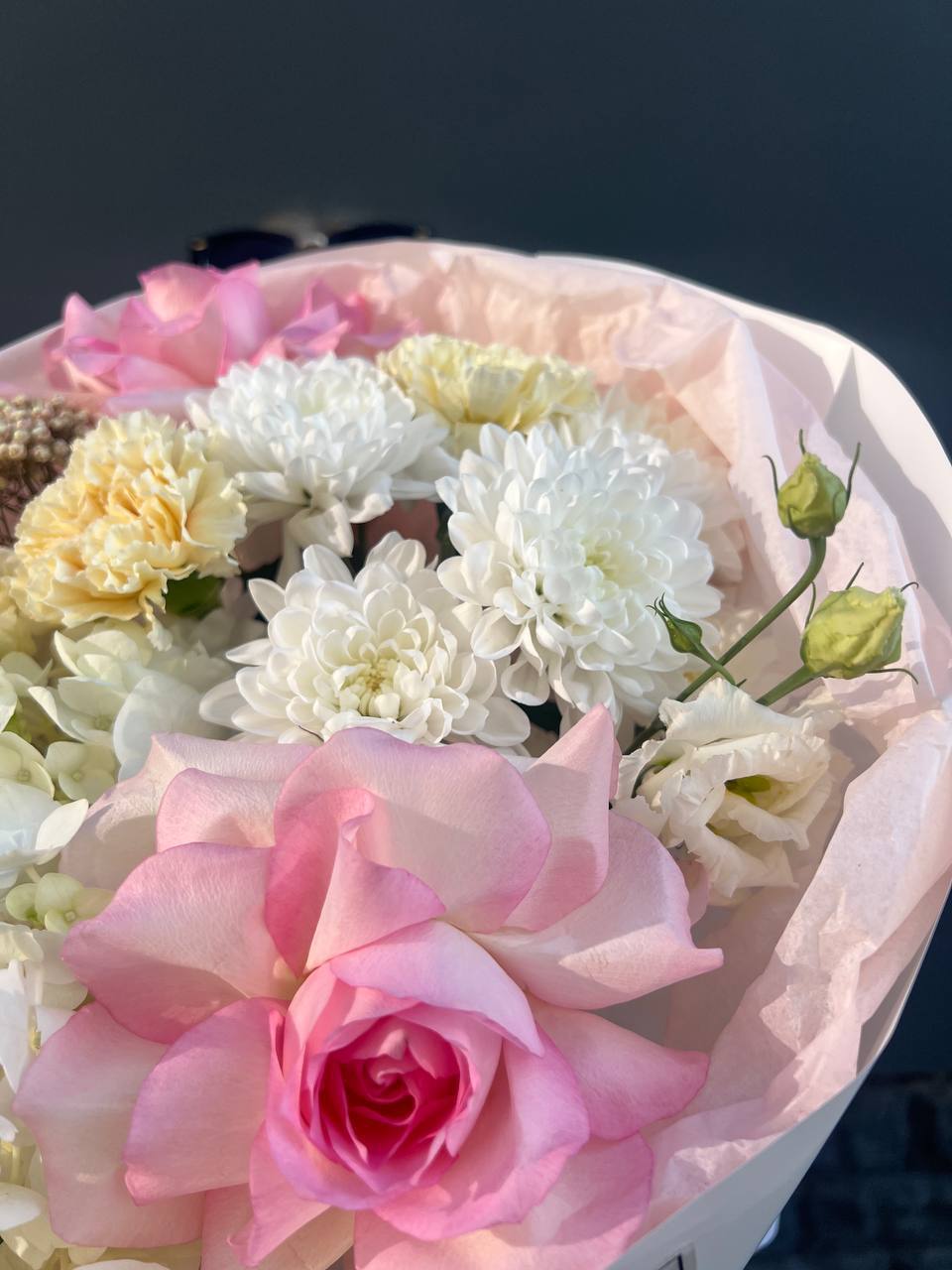 Хризантемы и розы соединяются с диантусами и маттиолой в яркой композиции. Декоративные бусины вплетаются в оформление и задают игривое настроение всему букету.