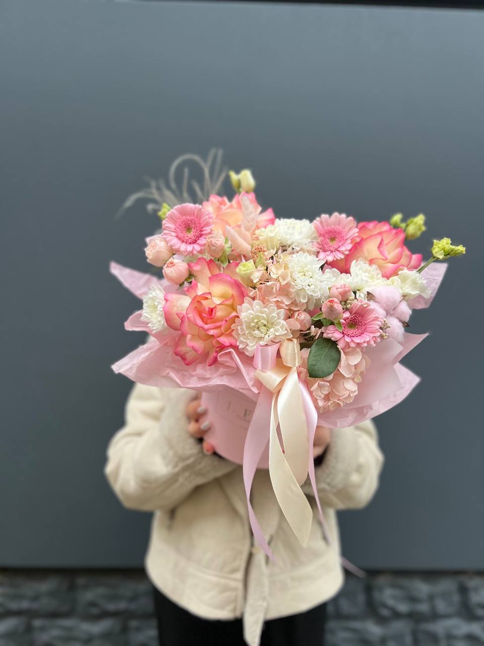 гортензия, хризантема, белая роза, гербера, статица, хлопок, упаковка.