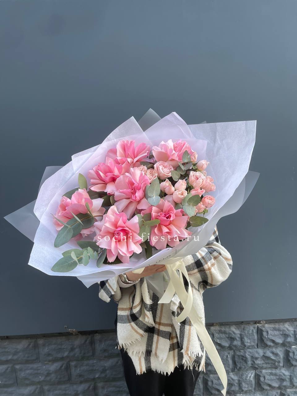 Розовая гамма раскрывается через махровые пионовидные бутоны и классические розы с плотной текстурой лепестков. Эвкалипт вплетается в композицию, создавая свежий акцент.