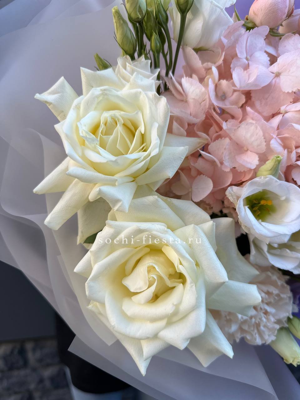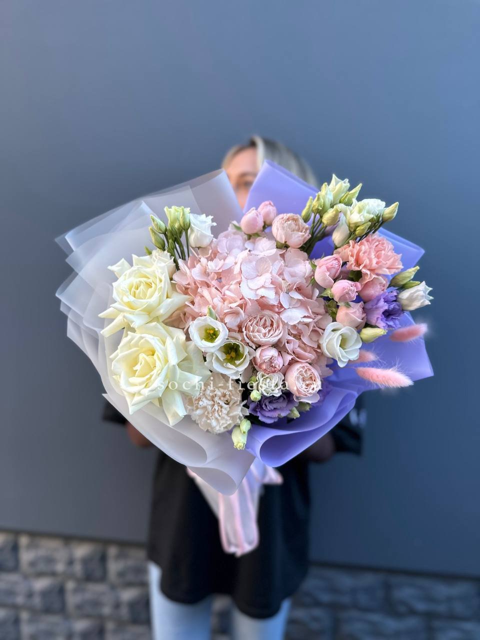 вывернутые розы, гортензия, пионовидные розы, эустома, лента, авторская упаковка.