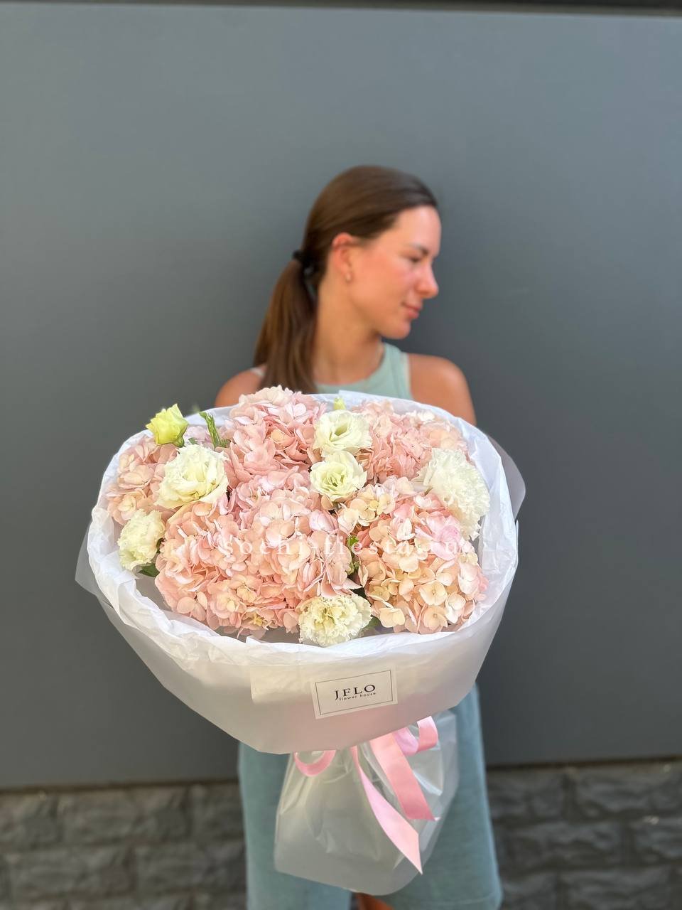 Розовая гортензия и эустома раскрывают свою красоту в каждом лепестке. Мягкие оттенки переходят один в другой, создавая спокойное и гармоничное впечатление.