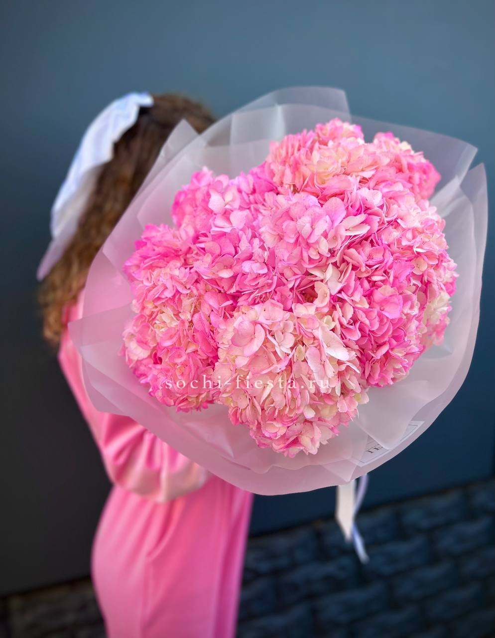 Гортензия создаёт воздушную базу, а герберы добавляют яркие точки цвета. Эвкалипт заполняет пространство между бутонами и придаёт композиции завершённость. Букет выглядит свежо и легко.