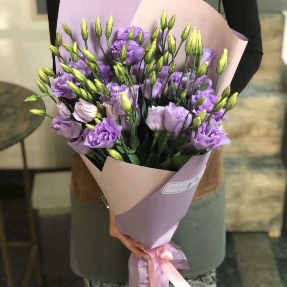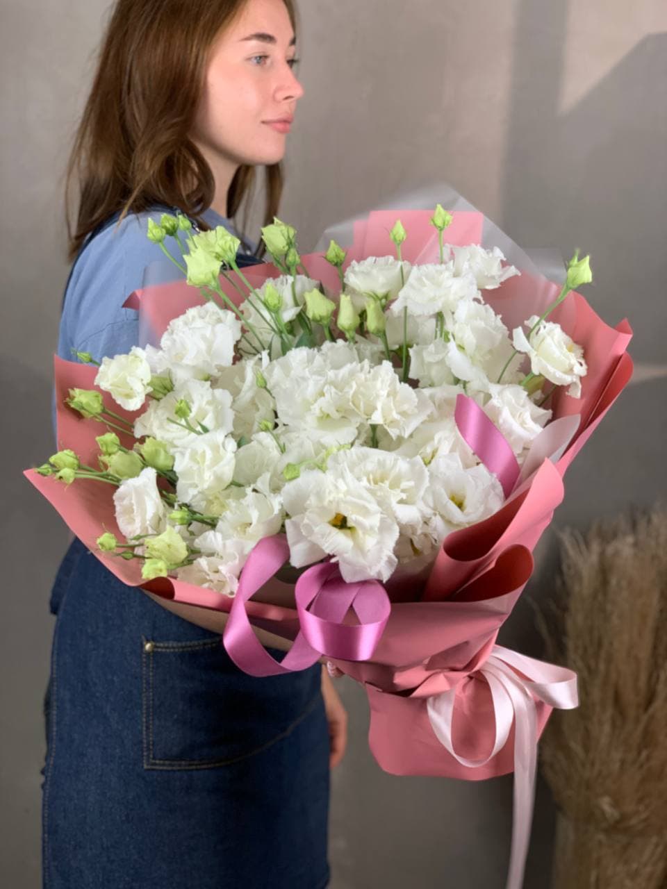 Сто один стебель белоснежной эустомы с многоярусными бутонами собраны в воздушный букет. Каждый цветок напоминает миниатюрную розу и вместе они образуют лёгкую скульптурную форму.