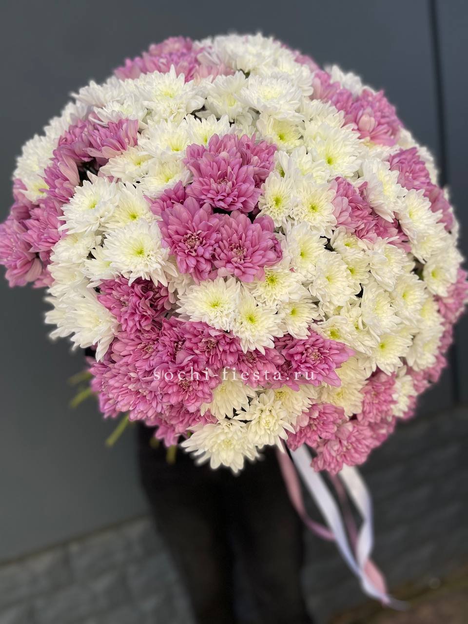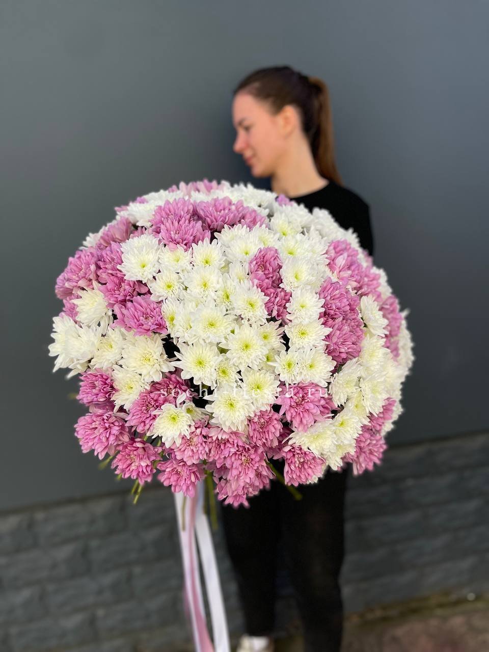 Двадцать пять кустовых хризантем раскрываются густыми шапками разных оттенков. Плотные многослойные бутоны формируют пышный букет с яркой игрой цвета и природной свежестью.