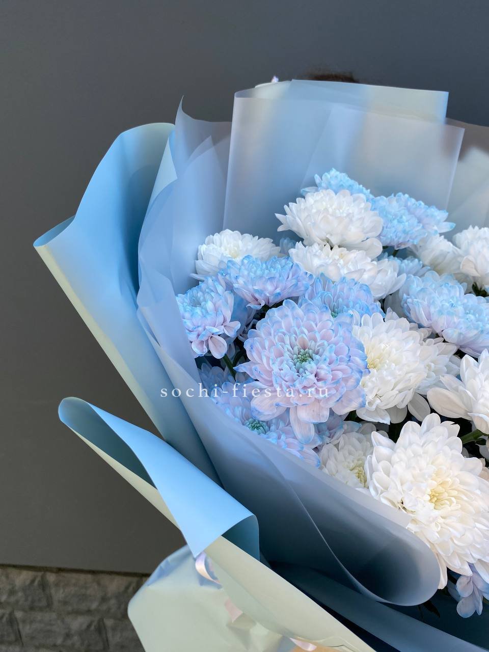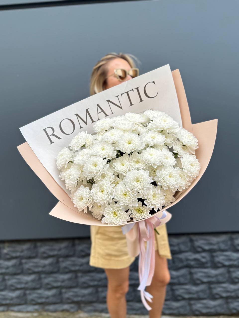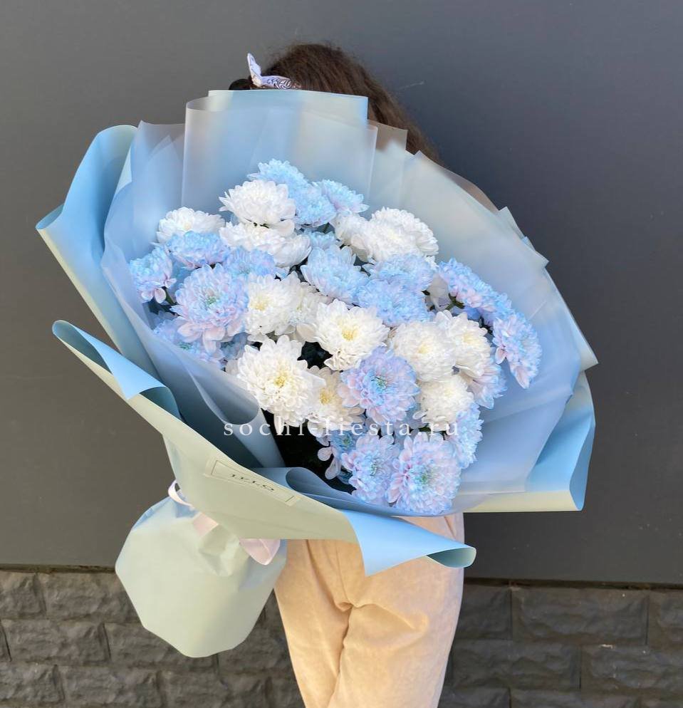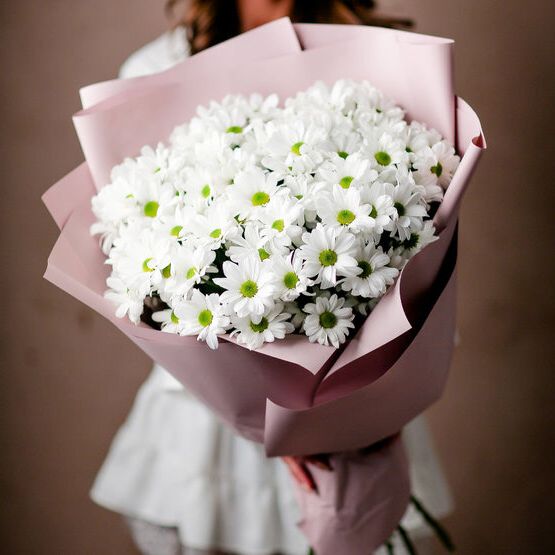 Девять кустовых хризантем собраны в плотный круглый силуэт. Каждая ветка раскрывается веером мелких соцветий, создавая объёмную текстуру. Букет держит форму и выглядит графично.