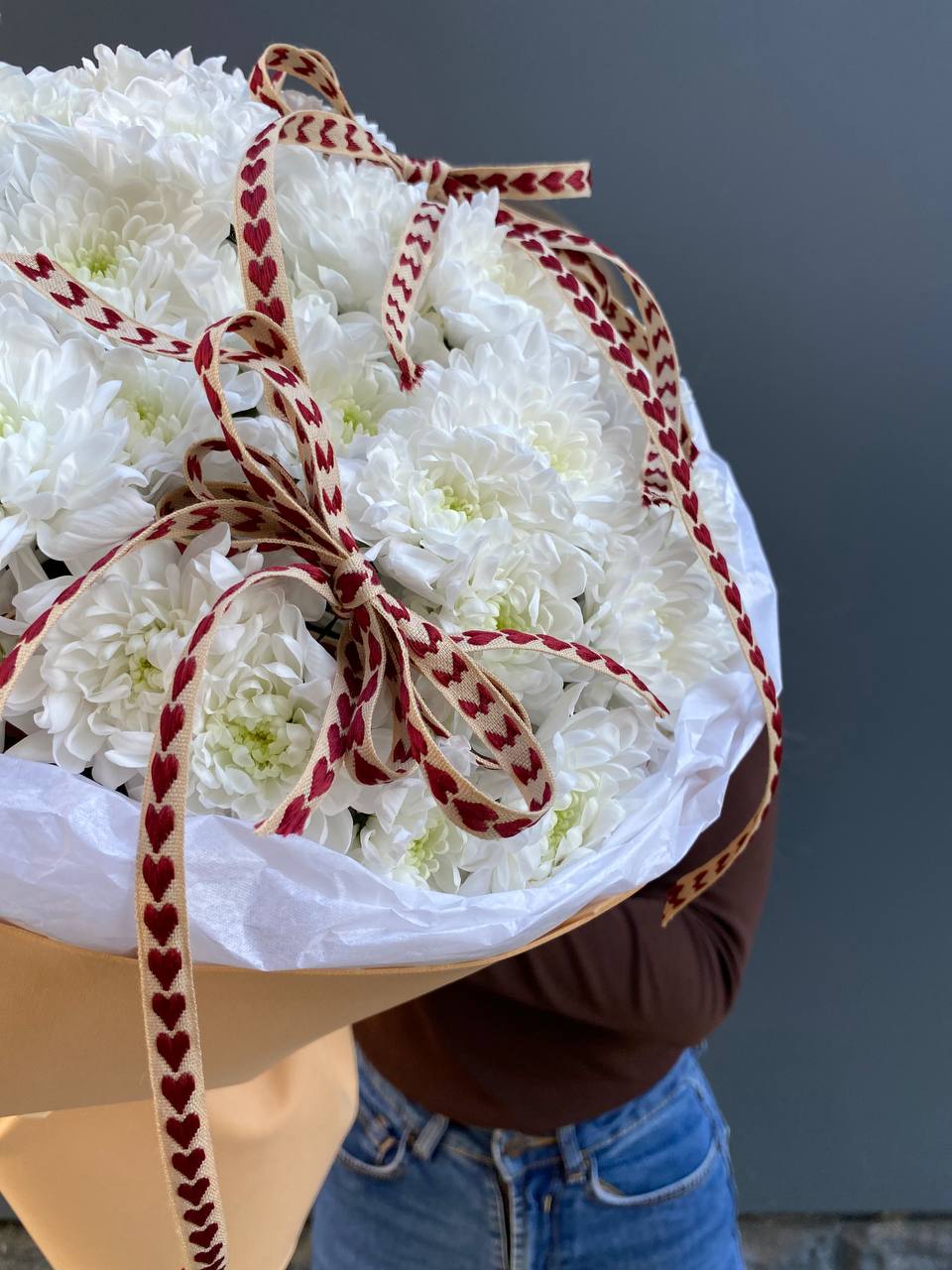 хризантема одноголовая - 9 шт., хамелациум, 5-7 шт., лента, дизайнерская упаковка.