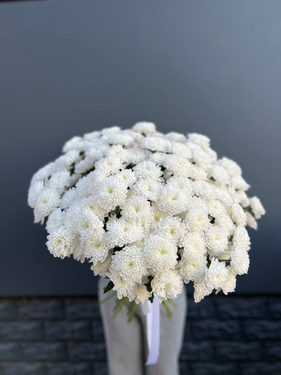 Одиннадцать веток кустовой хризантемы с множеством бутонов разной степени раскрытия. Воздушная композиция долго сохраняет свежесть и радует обилием мелких соцветий в лаконичной упаковке.