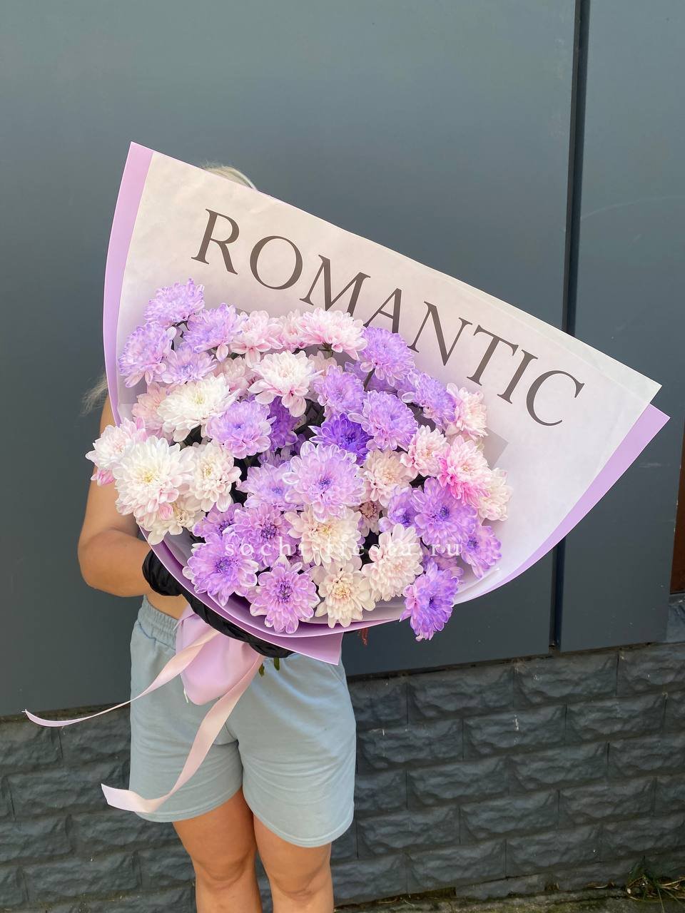 Сиреневая гамма с переходом в розовый создаёт мягкую дымку соцветий. Кустовые хризантемы собраны в плотную шапку, где каждая ветка раскрывается своим ритмом. Монохромная композиция для тех, кто ценит спокойную красоту.
