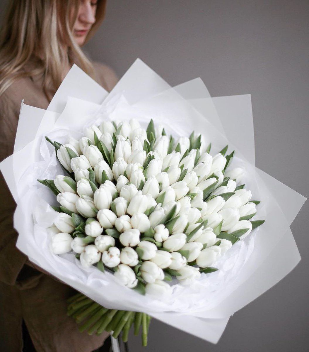 Сто один белоснежный тюльпан собран в плотную охапку с безупречной геометрией. Классическая упаковка сохраняет естественную красоту бутонов и подчёркивает масштаб композиции.