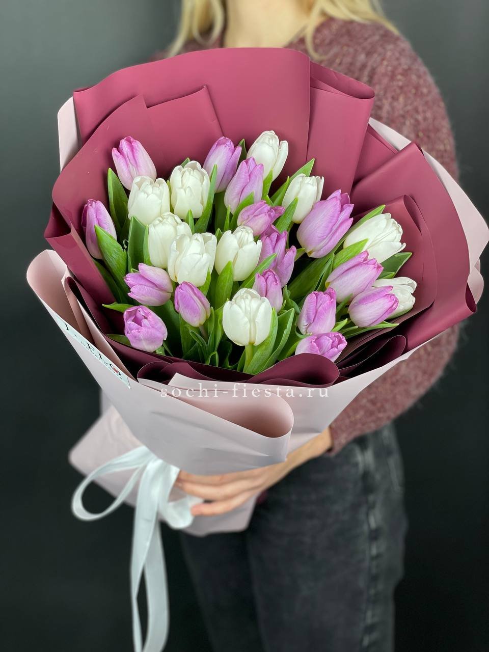 25 тюльпанов, лента, комбинированное оформление.