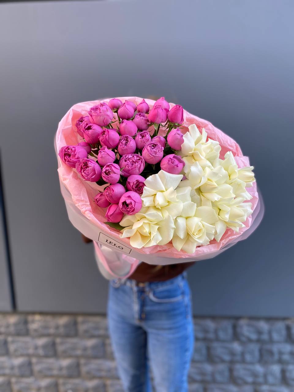 Пионовидные бутоны мисти баблс раскрываются мягкими волнами, создавая объёмную текстуру рядом с классическими белыми розами. Букет построен на игре плотности: пышные головки чередуются с точёными силуэтами, собирая взгляд к центру композиции.