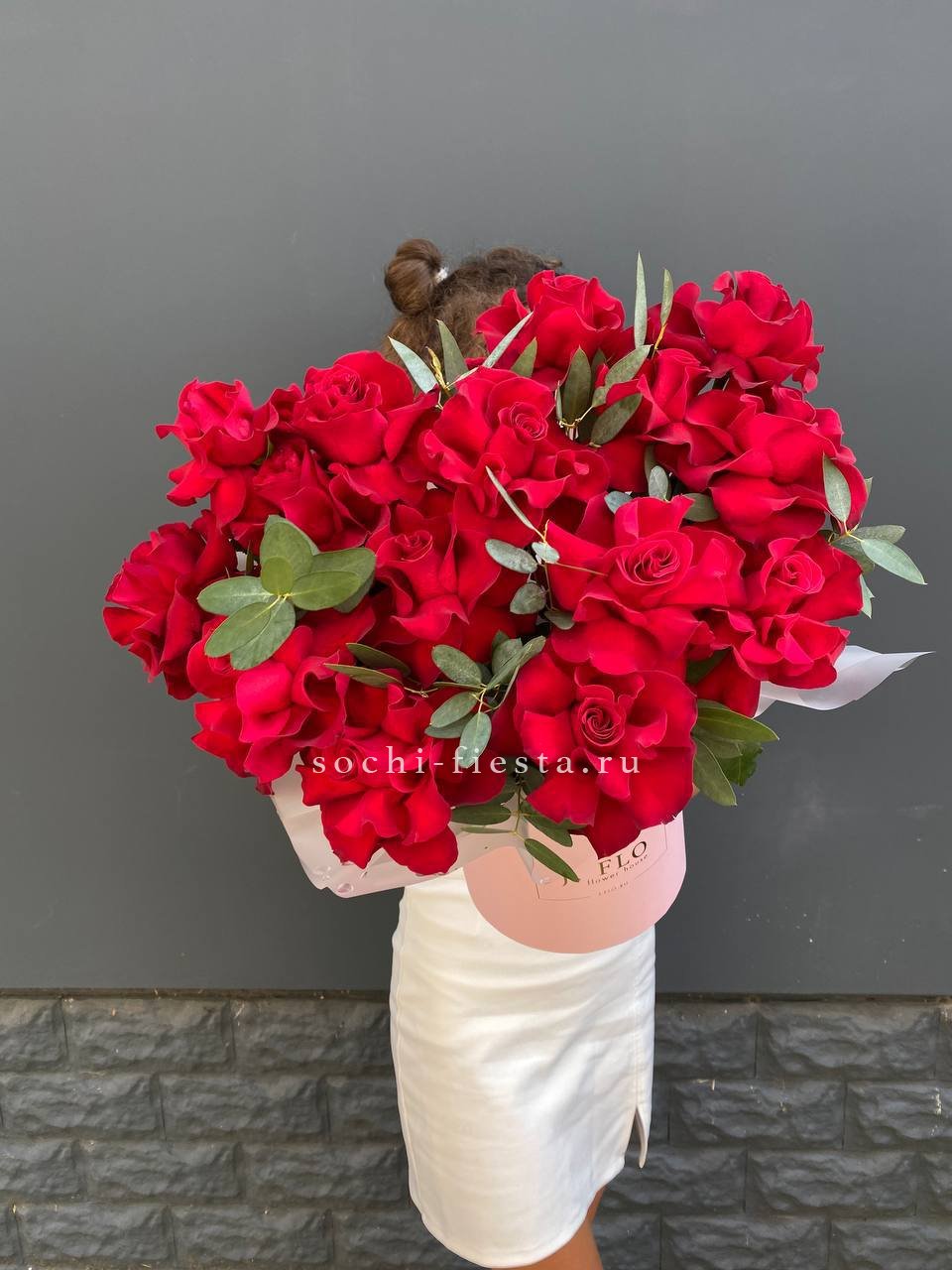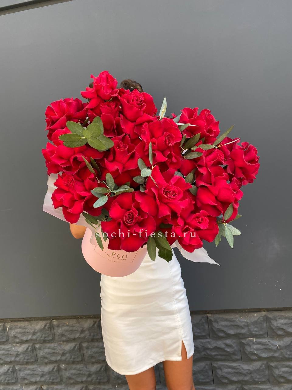 кустовые пионовидные розы Бомбастик, эвкалипт, цилиндр D13, бумага тишью, лента.