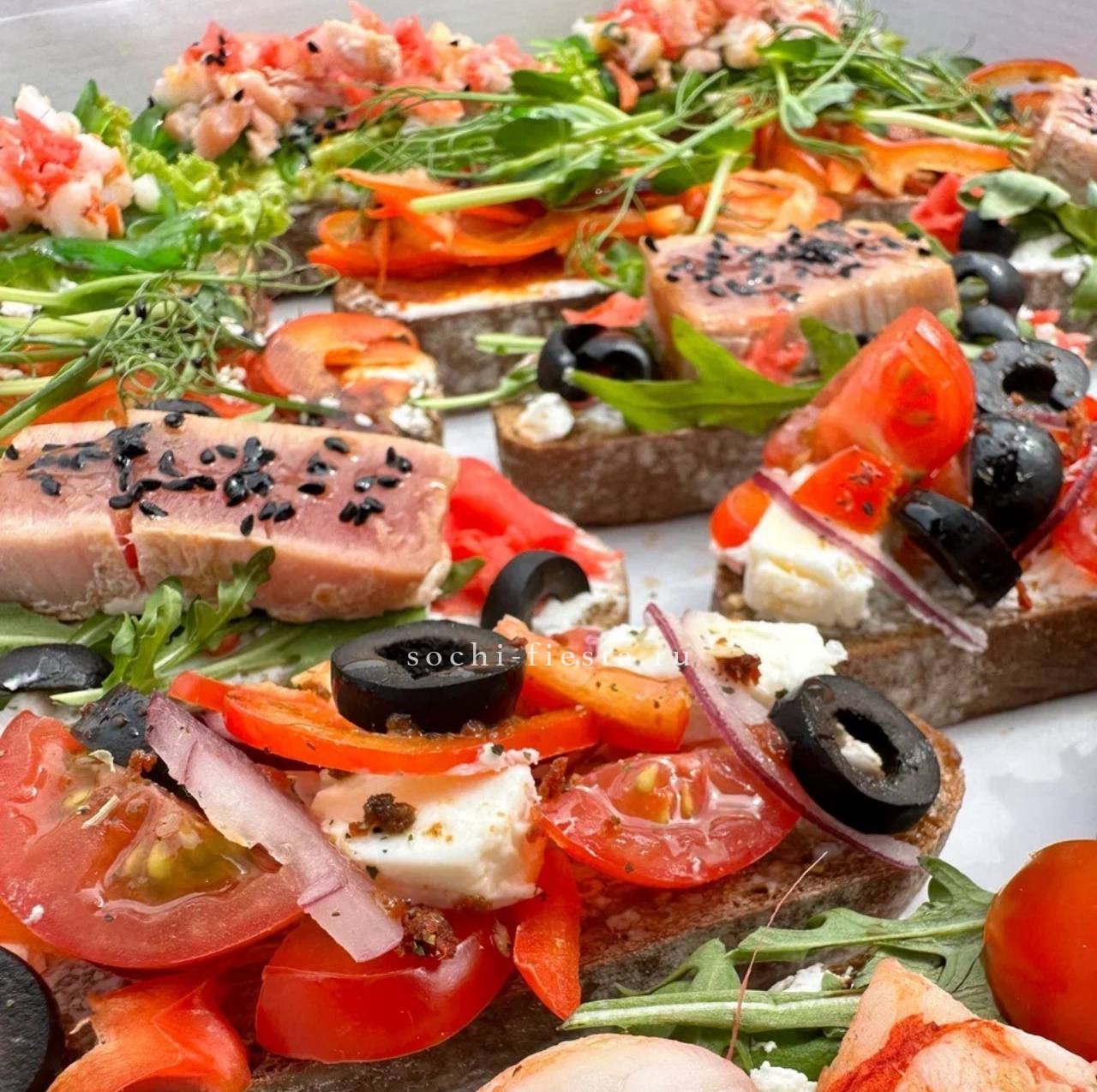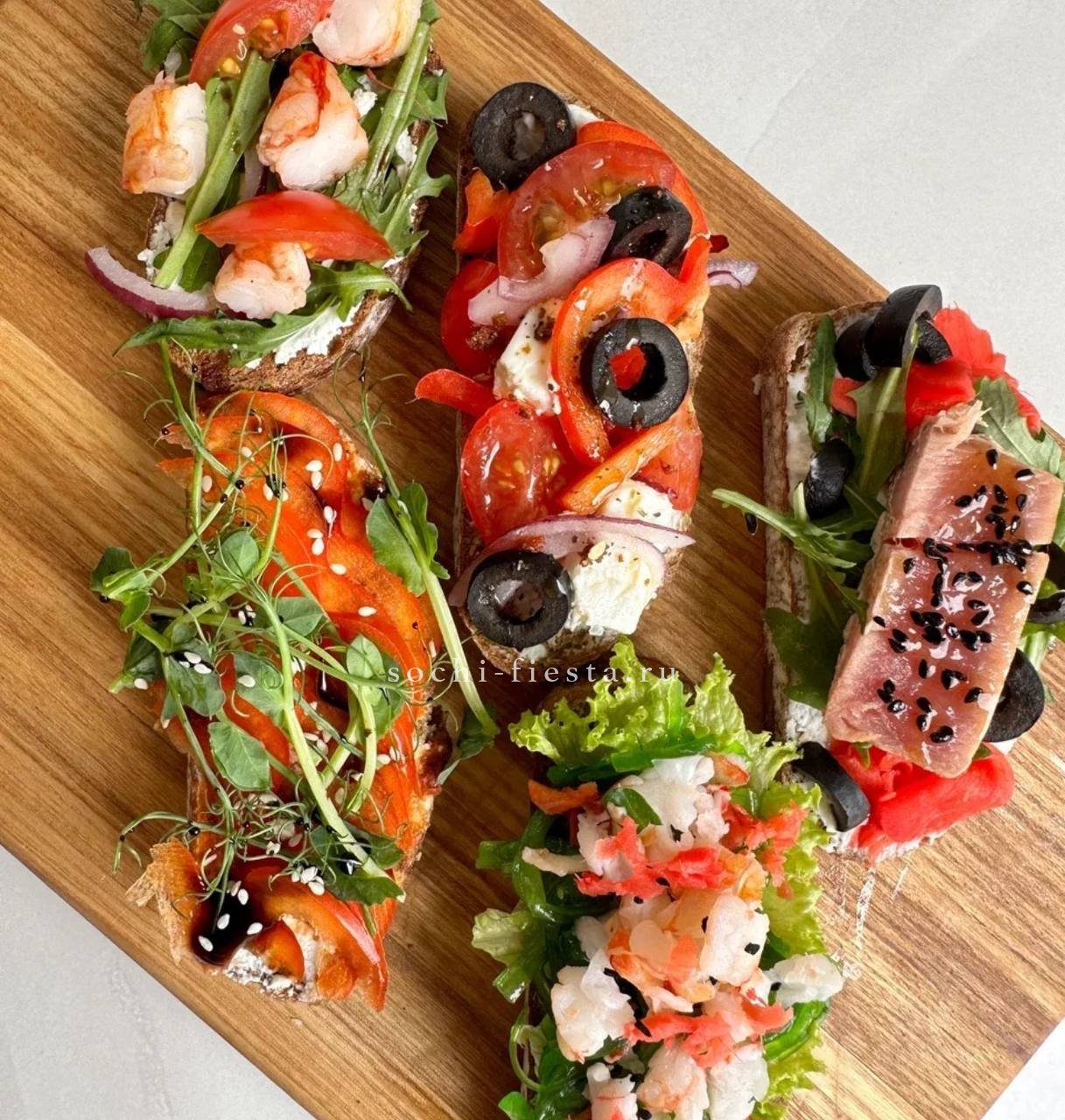 Лёгкие закуски собраны в один формат: хрустящие тосты с лососем, тарталетки с рыбным рийетом и фаршированные яйца. Каждая позиция готова к подаче и не требует дополнительной сервировки.