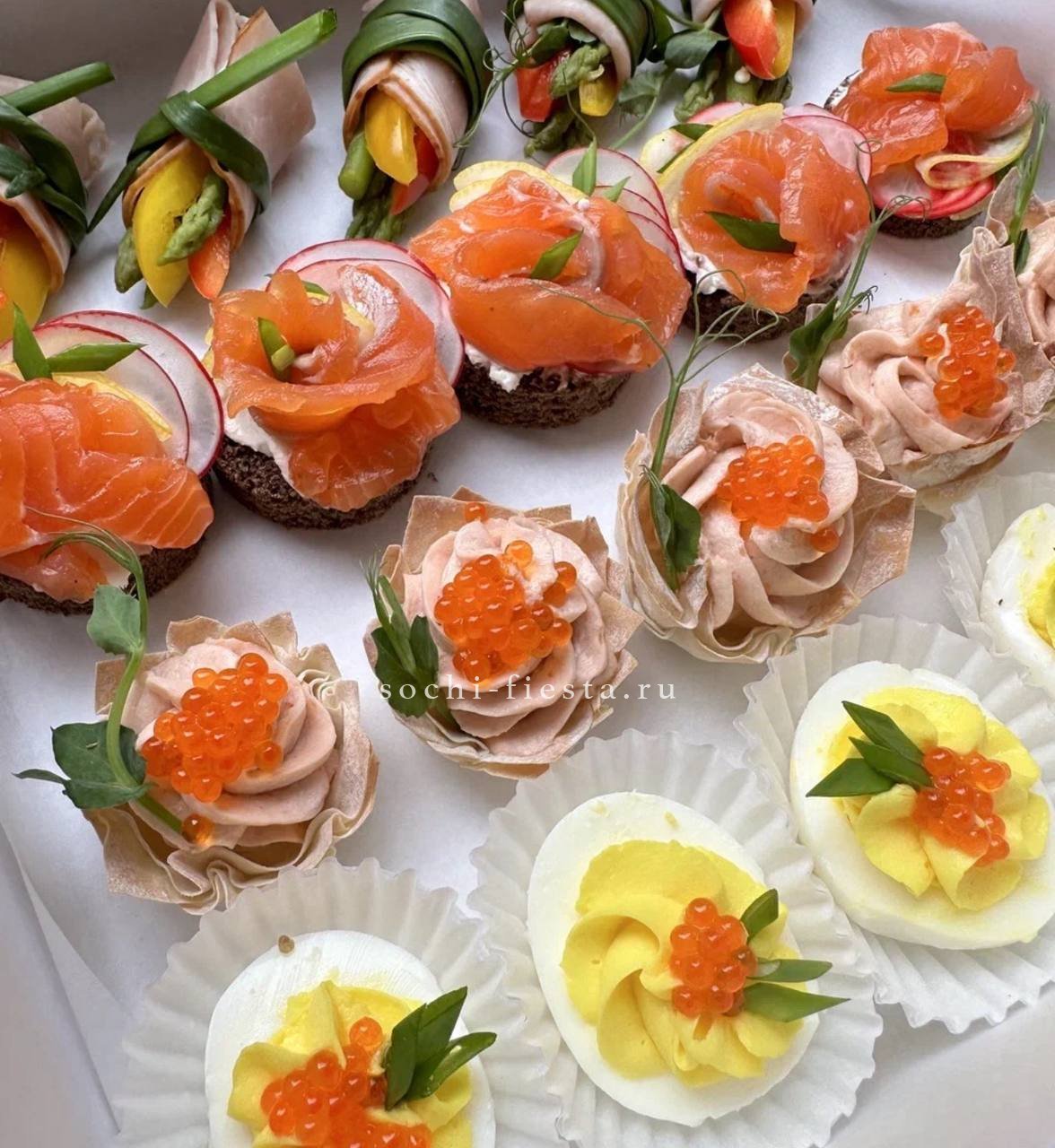 брускетта с голубым сыром и карамелизированной грушей- 3 шт.,  брускетта Цезарь- 3 шт., брускетта сырная с манго-маракуйя- 3 шт.