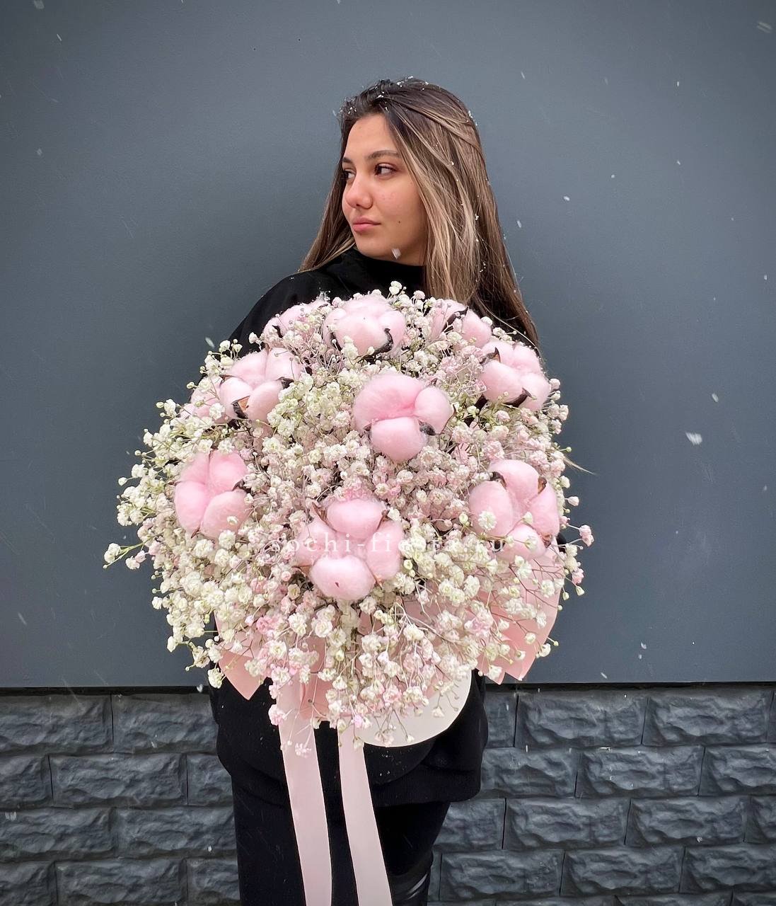 Радужные гипсофилы рассыпаются облаком вокруг хлопковых коробочек. Лёгкая воздушная масса создаёт ощущение утреннего сада после дождя.
