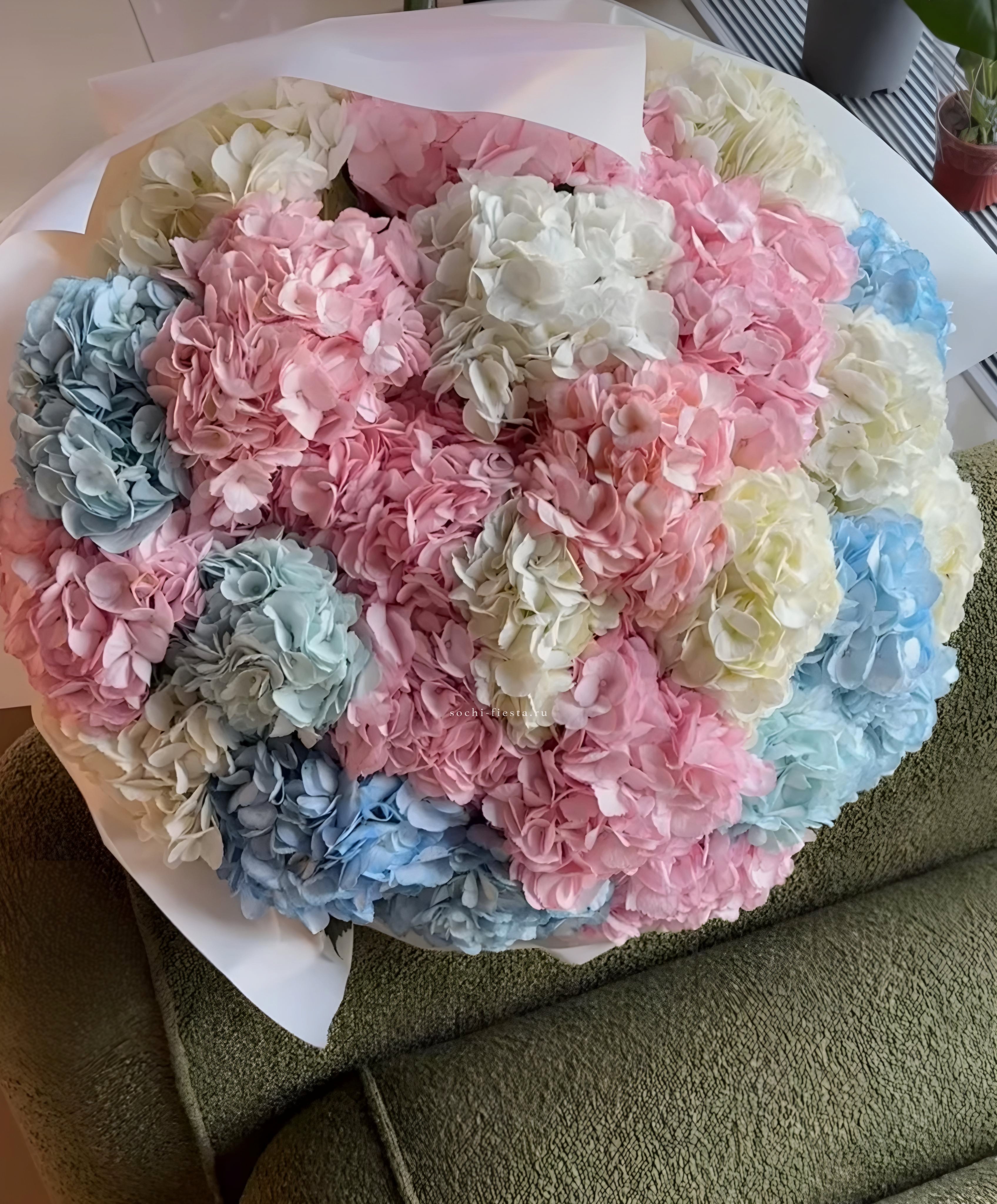 гортензия, диантус, розовые розы, маттиола, эустома, амарант, бусы (возможна замена), джутовое кашпо.