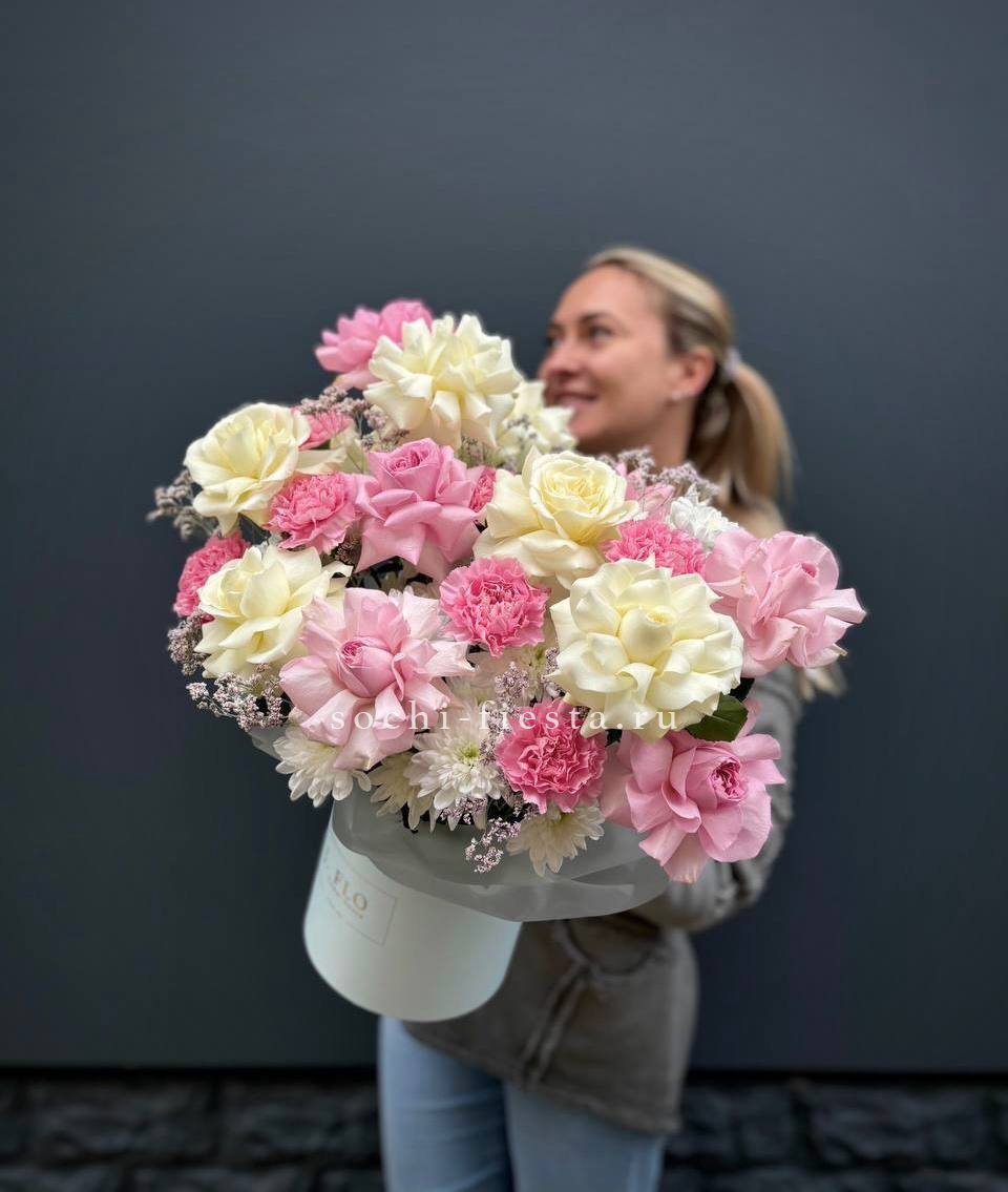 Для заказа товара "Коробка французских роз и диантусов "Бони"" с доставкой в Смоленске нажмите в корзину