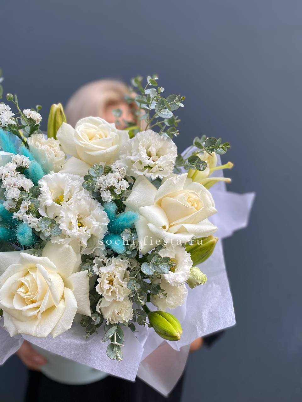 Голубая гортензия задает спокойный тон всей композиции, где статица и лагурус добавляют воздушности. Розы и лилии дополняют образ свежими акцентами без лишней пышности.