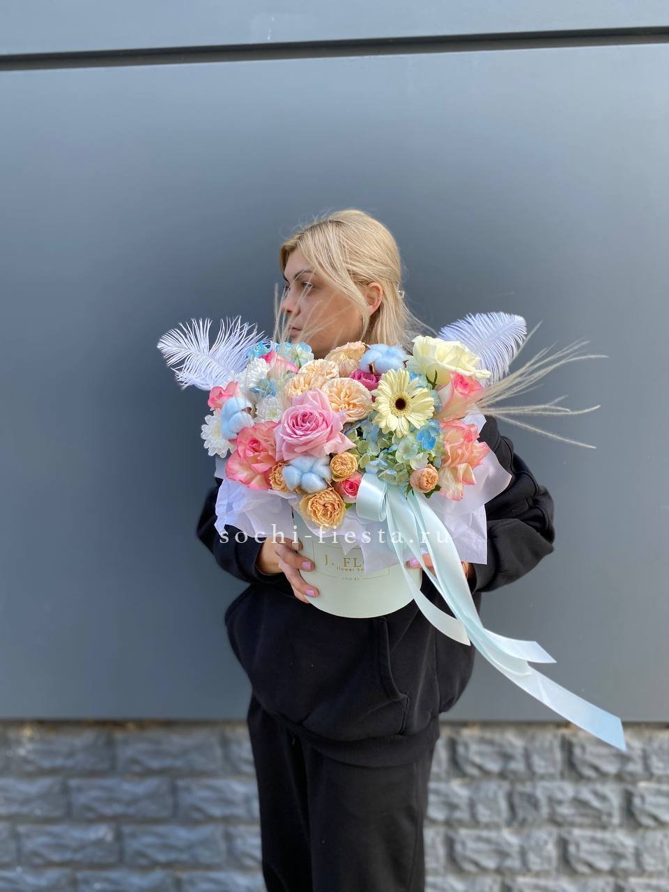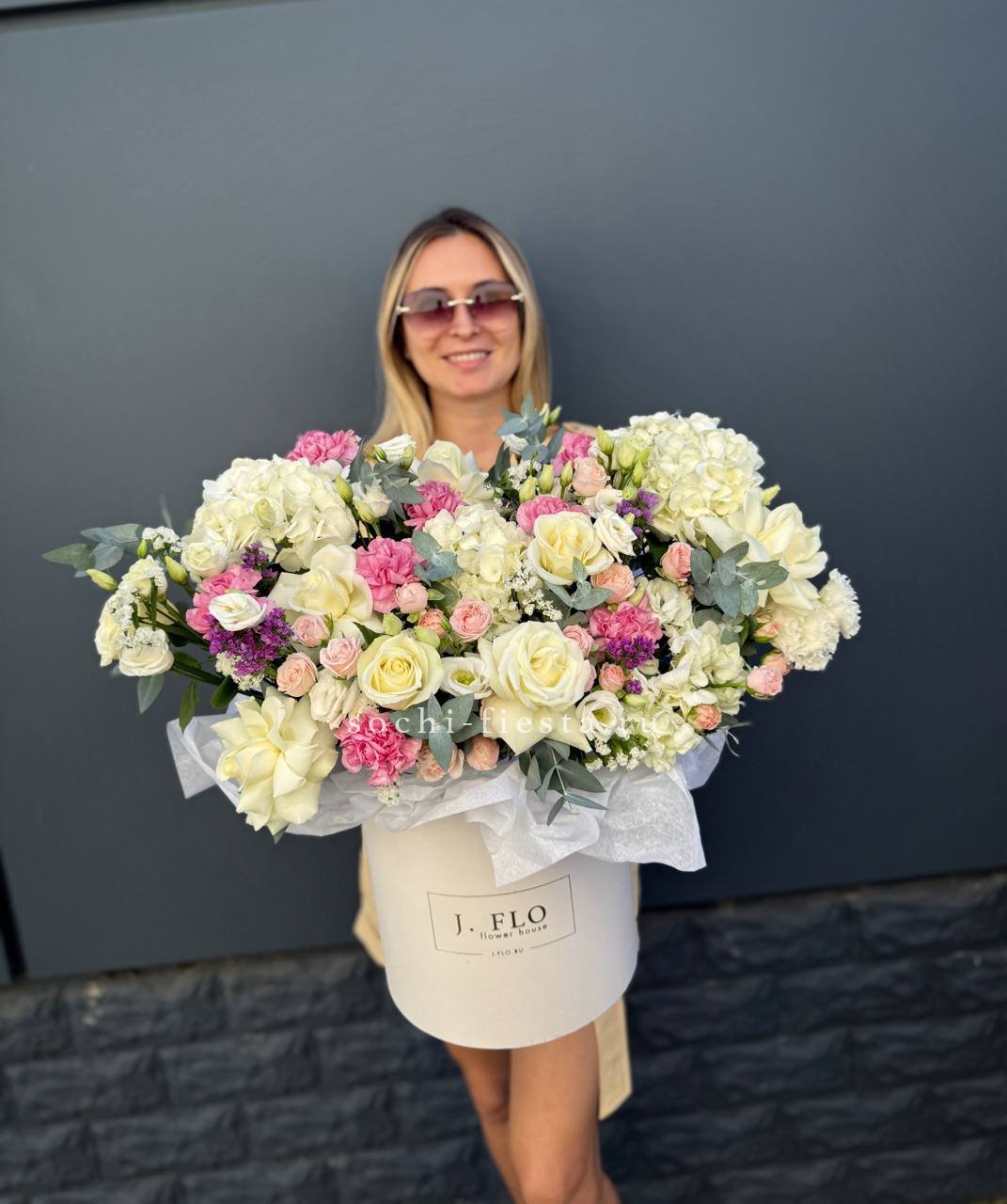Белоснежные розы и воздушная эустома соседствуют с пышной гортензией и яркими вспышками статицы. Композиция собрана плотно, каждый цветок находит своё место в общем ритме.