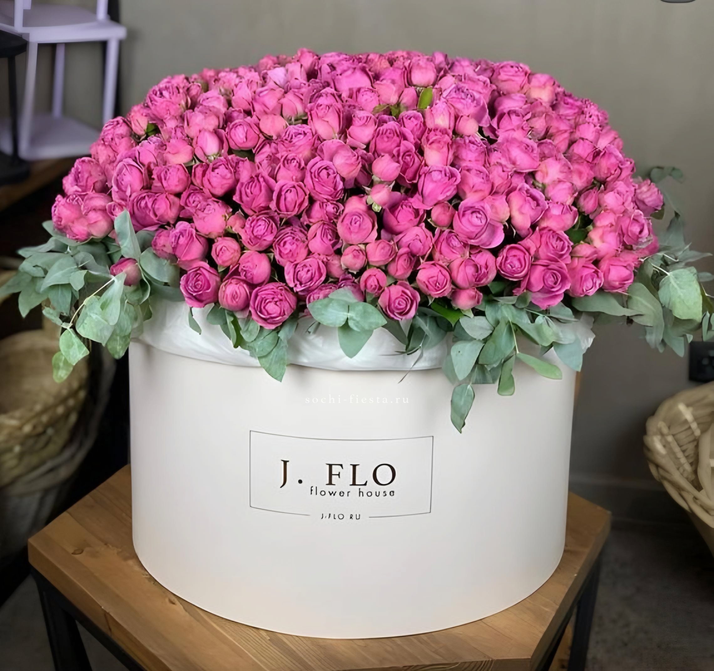 гортензия, вывернутые розы, диантус, кустовая роза, эустома, бокс D20, тишью.