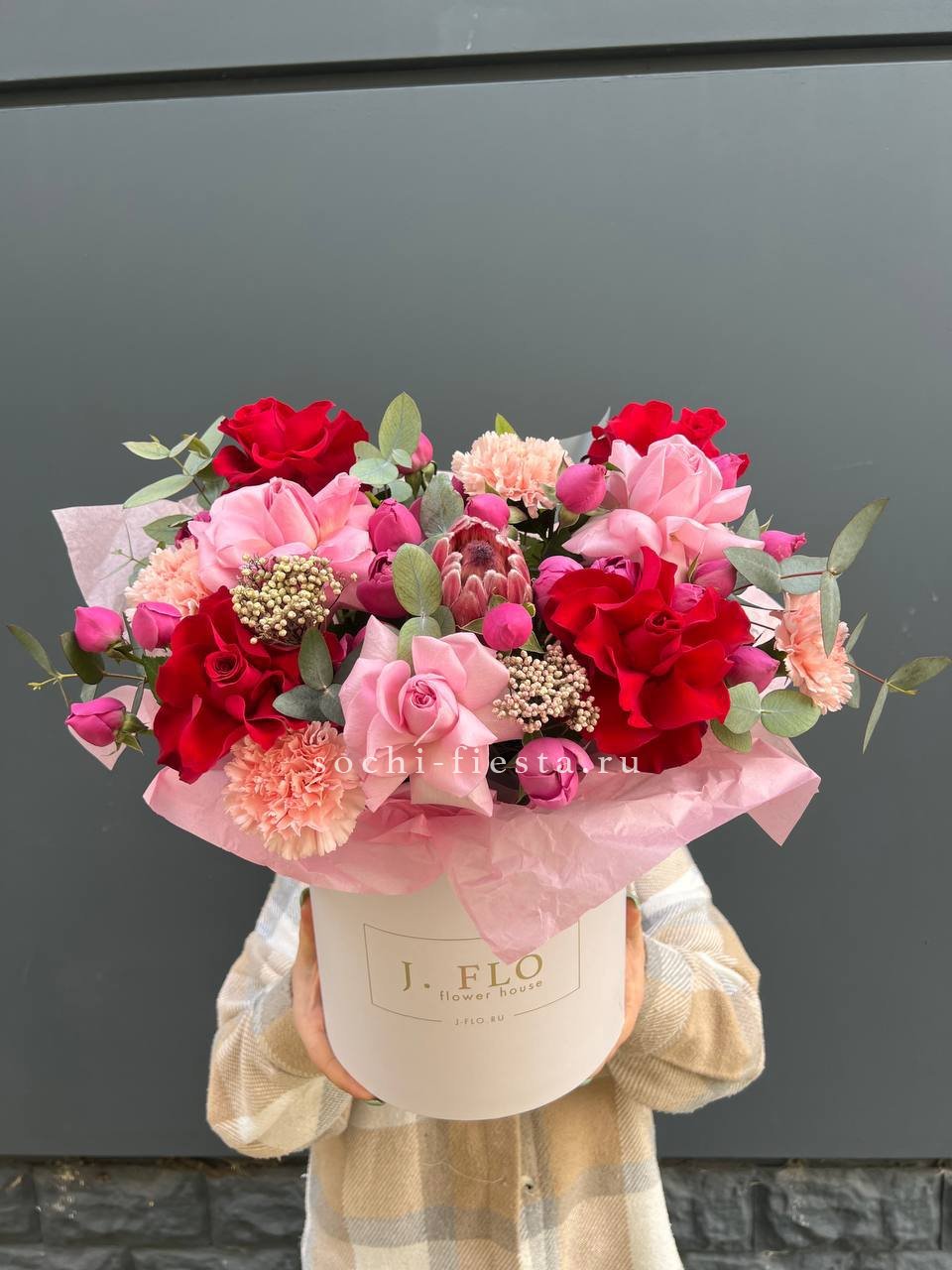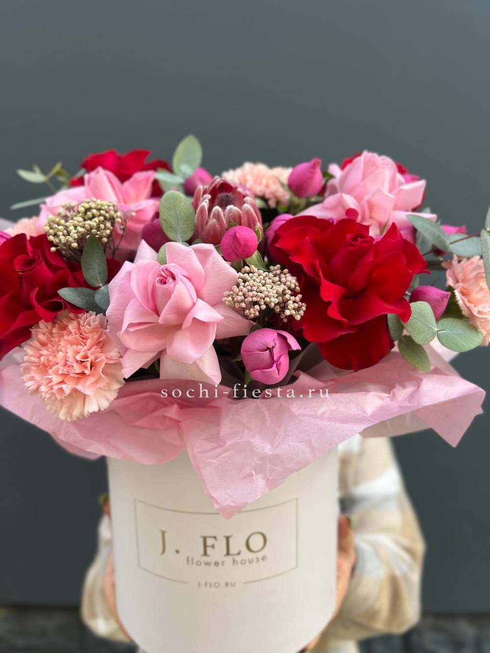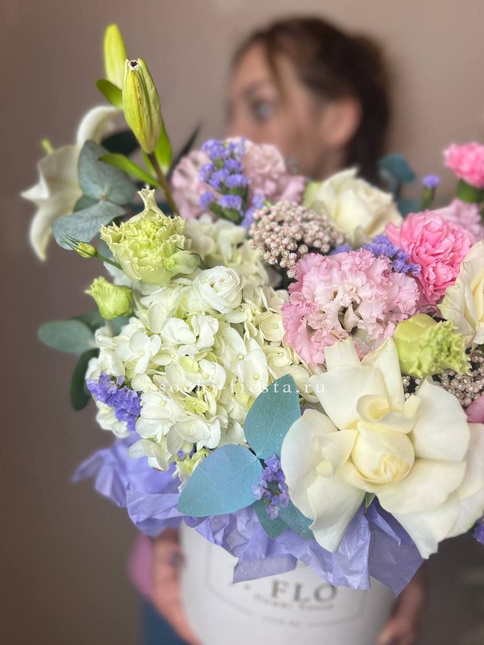 гортензии, эустома, розы, бомбастик, эвкалипт, антиринум в боксе 25.