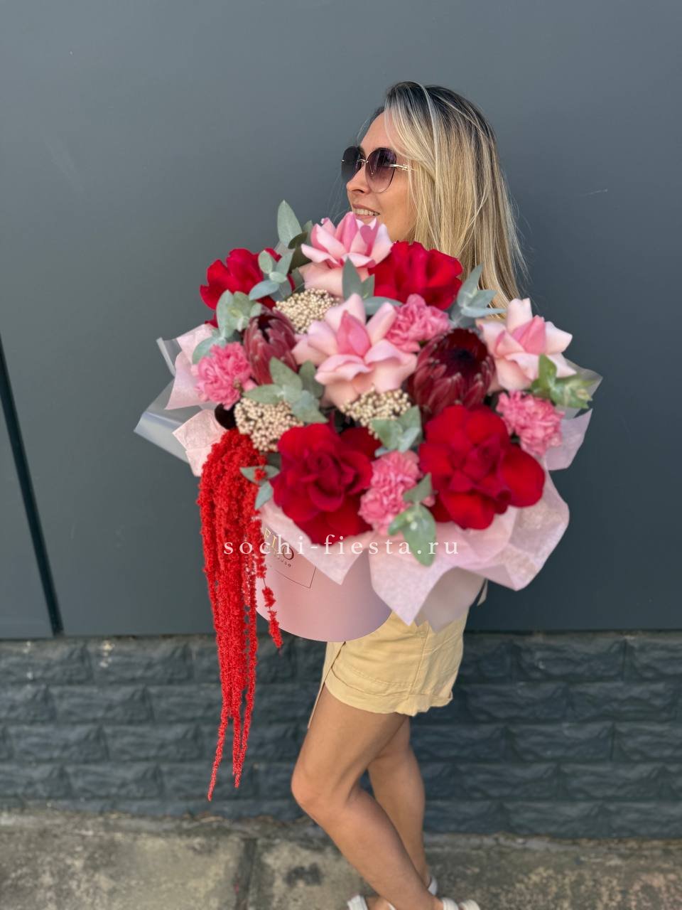 кустовая роза, лилия, диантус, лотос, эвкалипт, бокс 13.