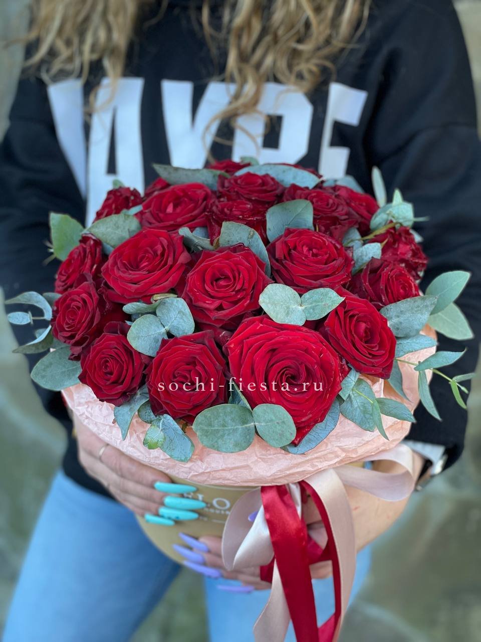Пионовидная роза Бомбастик образует плотные бутоны с множеством лепестков. Эвкалипт добавляет свежести и завершает форму. Компактная коробка удобна для передачи из рук в руки.