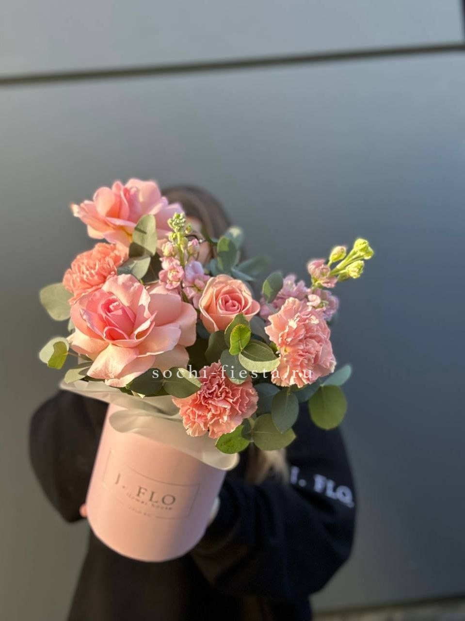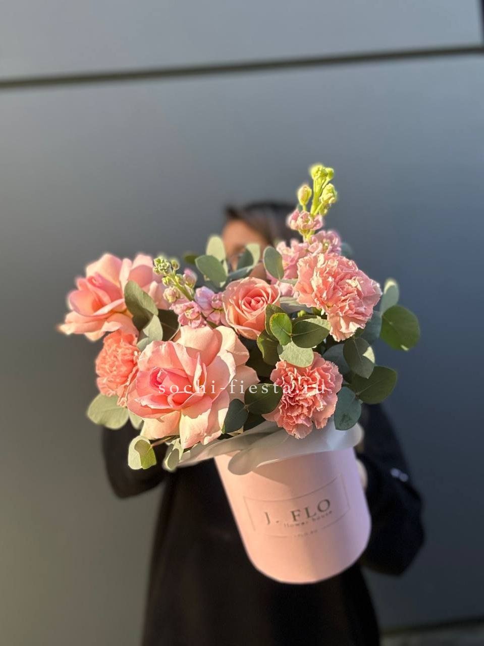 Французские розы соседствуют с пушистой маттиолой и яркими диантусами в компактном цилиндре. Разная высота бутонов создает живой ритм и легкую динамику.