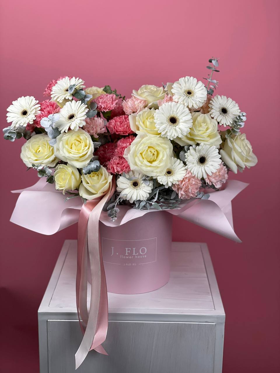 Пионовидные бутоны и шапки гортензии заполняют бокс густой textured массой. Композиция держит форму и создаёт ощущение цветочной волны в ограниченном пространстве.