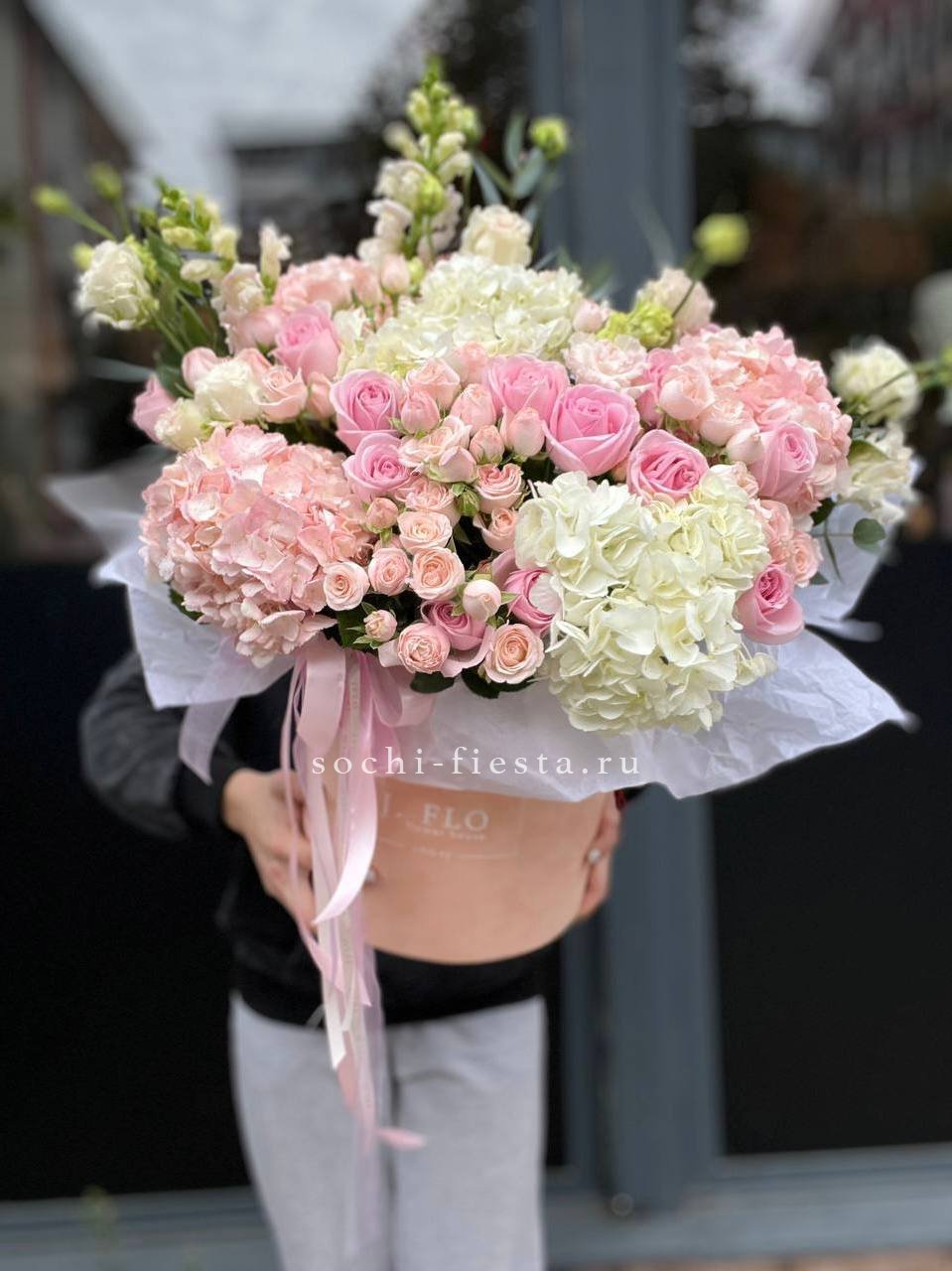 гортензия, французские розы, диантусы, эустома, цилиндр D16, бумага тишью.