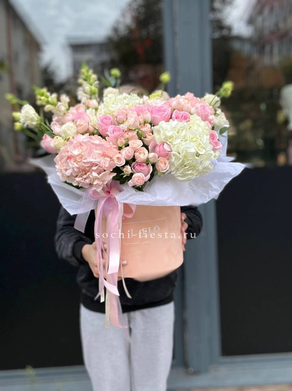 Гортензия создает пышную основу для французских роз и диантусов с эустомой. Цилиндр компактен и не требует дополнительной вазы. Розовая гамма раскрывается слоями от бледных до насыщенных оттенков.
