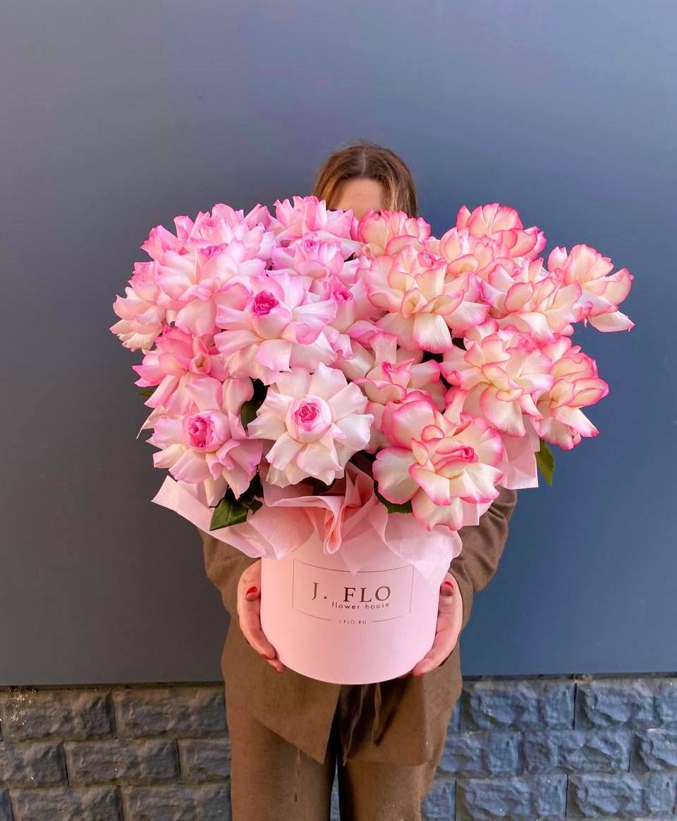 Розовая палитра переходит от французских роз к кустовым Джульетта с добавлением хлопка. Композиция в цилиндре сочетает воздушность и плотность фактур.