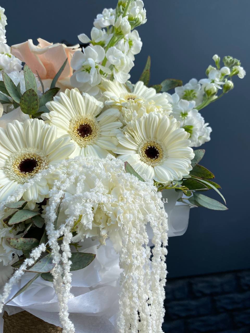 герберы, французские розы, маттиола (аналог), диантусы, амарант и эвкалипт. Цвет роз и диантусов могут отличаться, в тон композиции.