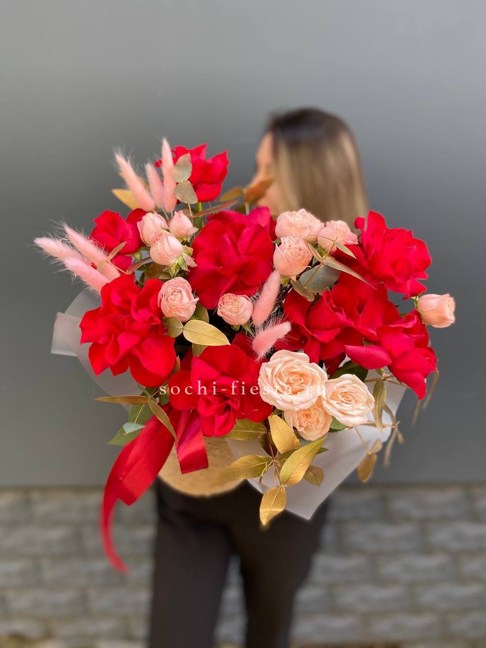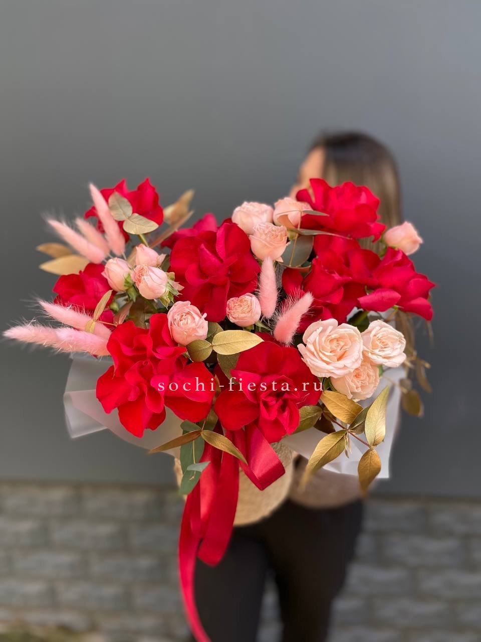 Красные розы и бомбастик выделяются на фоне золотистого эвкалипта и пушистого лагуруса. Тёплая гамма и разнообразие текстур собраны в компактную композицию с выразительным характером.