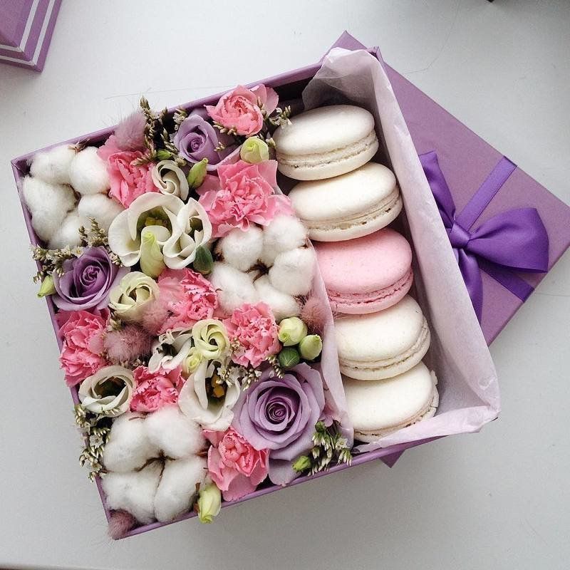 Пионовидные розы Мисти Баблс раскрываются пышными головками рядом с воздушной эустомой. Бархатистые лепестки создают объёмную текстуру, а макаронс добавляют сладкий акцент.