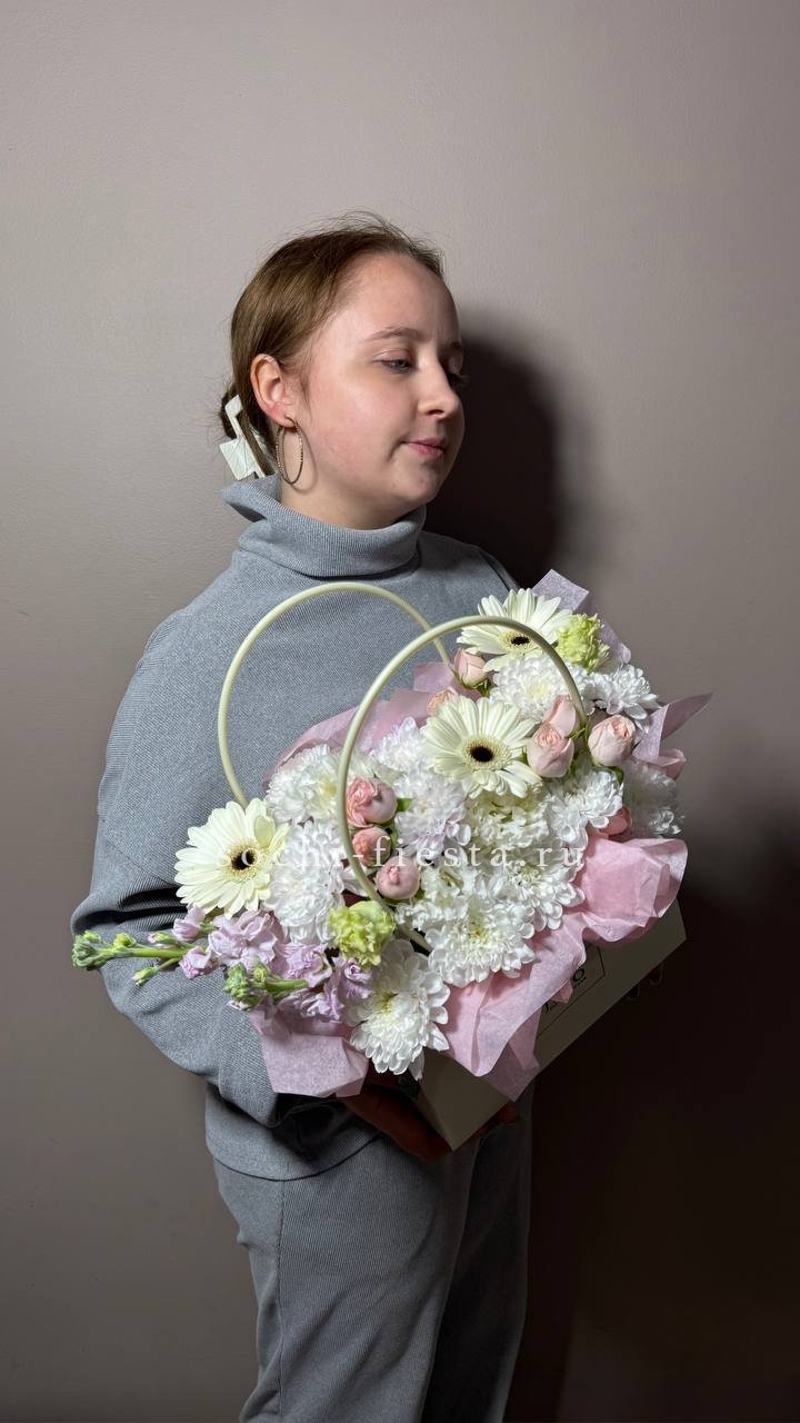 Белоснежные хризантемы и эустома создают светлое облако, которое разбавляют акценты гербер и душистой маттиолы. Композиция в сумочке готова к вручению сразу после получения.