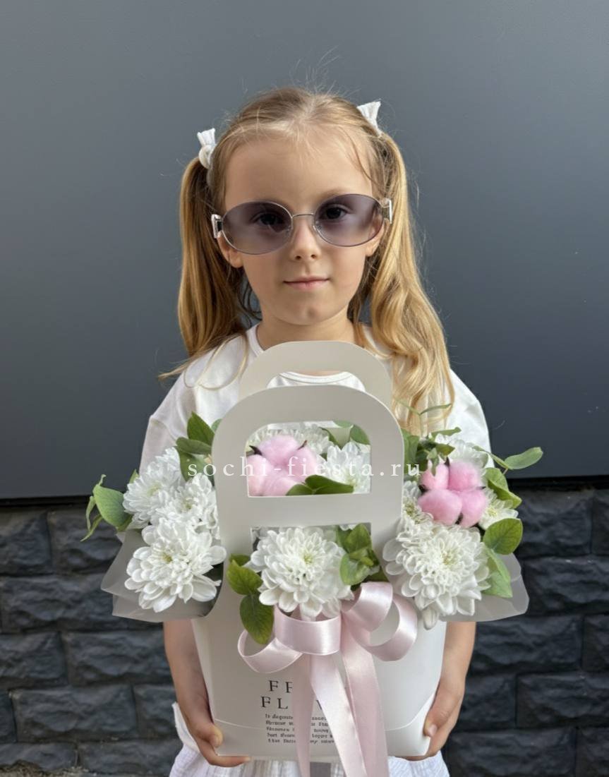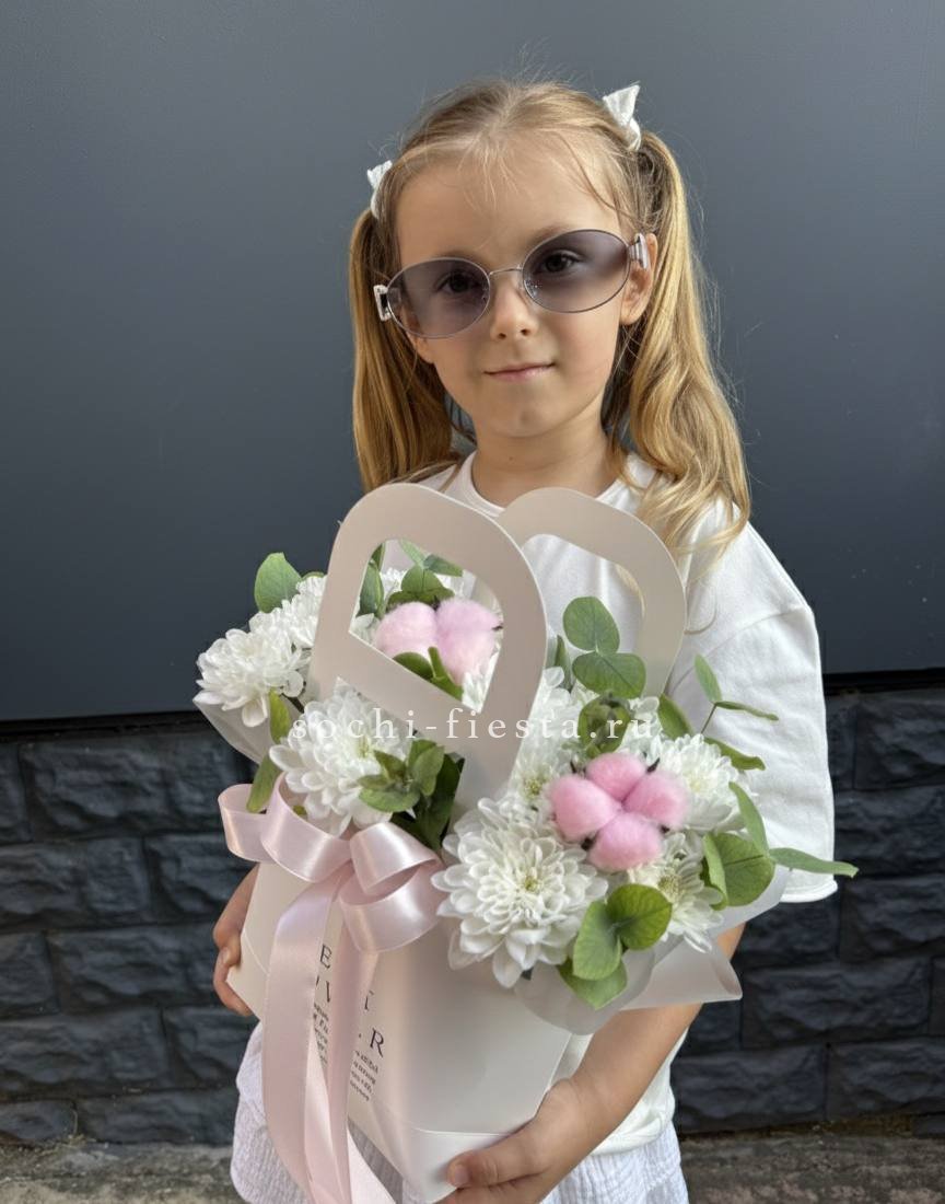 Гортензия создает объемную базу, а герберы и кустовые розы добавляют яркие акценты по всей композиции. Эвкалипт обрамляет сумочку легкими серебристыми ветвями.