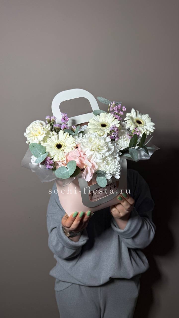 джумилия, гербера, мисти баблс, диантус, хлопок, лагурус, сумочка.